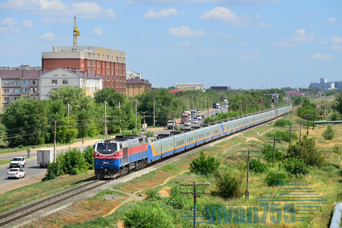 Вот американско-казахстанский тепловоз Evolution ТЭ33А с составом Тальго — поезд Алма-Ата — Уральск: