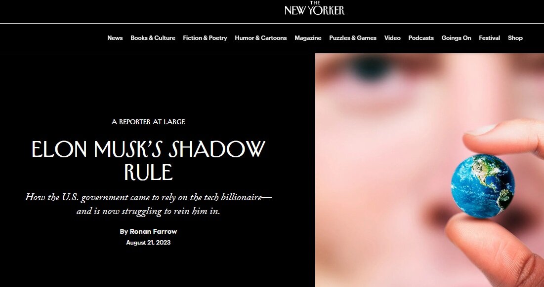 Позавчера в издании The New Yorker вышла просто изумительная заметка про Илона Маска. Для любителей почитать в оригинале в конце заметки обязательно выложу ссылку. Итак, заголовок гласит: Правило теней Илона Маска Как правительство США стало полагаться на технологического миллиардера и теперь изо всех сил пытается его обуздать. Ронан Фэрроу 21 августа 2023 г. Там букв очень много, кто хочет - сам переведёт и прочитает целиком, я же попытаюсь донести до вас лишь общий смысл. Для начала речь идёт о Starlink. Точнее о том, что совместные американо-небратские войска оказались в полном вакууме, когда Илон кратковременно отключил свою систему (по другой версии был технический сбой), заявив, что устал поддерживать работоспособность за свой счёт. Мы пересекли эту границу, и Starlink перестал работать. Последствия были немедленными. Связь пропала, подразделения были изолированы. Когда вы в нападении, особенно командирам, вам нужен постоянный поток информации от батальонов. Командирам приходило
