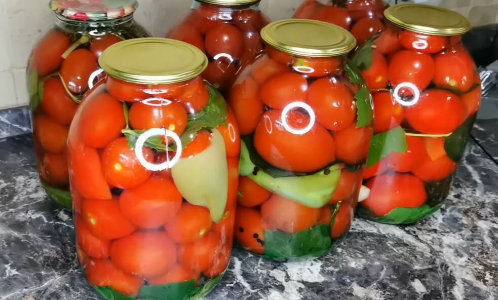 Привет! Сегодня хочу поделиться с вами семейным рецептом маринованных помидор на зиму. Так готовила моя бабушка, потом мама и теперь я. Проверенный рецепт годами, очень вкусно. Для этого рецепта я обязательно использую листья вишни, листья черной смородины и листья на букву х )), укроп ну и конечно сами помидоры. Для этого рецепта очень удачно подходят помидоры сливки. Подготавливаем ингредиенты, все овощи и зелень очень тщательно промываем. Болгарский перец разрезаем на 2-4 части, чеснок чистим, листья х... режем на небольшие кусочки (или рвем руками, как вам удобно). Ставим заранее воду на огонь. Я закатываю в трехлитровые банки. На дно банки выкладываем листья х...(всю зелень добавляем по вкусу). Дальше выкладываем зонтики укропа (2-3 шт), добавляем чеснок (я кладу 5 шт), смесь душистого и черного перца и гвоздику - по щепотке. Далее заполняем помидорами. На дно банки стараюсь класть помидоры побольше и дальше, чем выше, тем поменьше кладу. До середины заполнили, выкладываем бол