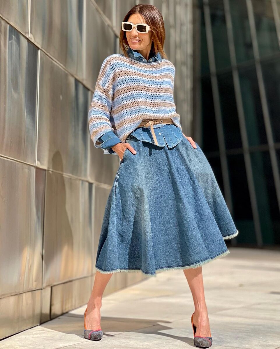 - Интересный образ в джинсовом стиле. Джинсовая юбка покроя полусолнце выглядит эффектно. Модель «итальянской» длины, то есть, немного ниже колена. К юбке добавили джинсовую рубашку, надев её навыпуск. Поверх рубашки надели прямой джемпер, связанный крючком узором из полос голубого, бежевого и белого цвета. Джемпер свободный со спущенным плечом. Линия талии подчеркнута тонким ремнем бежевого цвета. Джемпер частично спереди заправлен за ремень.
