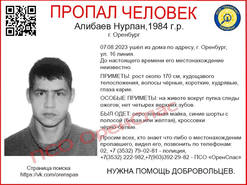 Местонахождение жителя областного центра до настоящего времени не установлено, сообщили «Оренбург Медиа» в ПСО «ОренСпас». Нурлан Алибаев 1984 года рождения пропал 7 августа 2023 года. Он ушёл из дома по улице 16 линия и не вернулся. До настоящего времени его местонахождение оренбуржца не установлено. Его поиски продолжаются. Приметы: рост около 170 см, худощавого телосложения, волосы чёрные, короткие, кудрявые, глаза карие. Особые приметы: на животе вокруг пупка следы ожогов; нет четырех верхних зубов. Был одет: серо-зелёная майка, синие шорты с полосой (белая или жёлтая), кроссовки чёрно-белые. Всех, кто что-либо знает что-либо о местонахождении пропавшего или видел его, просят позвонить по телефонам: 02, +7 (3532) 79-02-81 — полиция, +7(3532) 222-982,+7(903)392-29-82 — ПСО «ОренСпас».