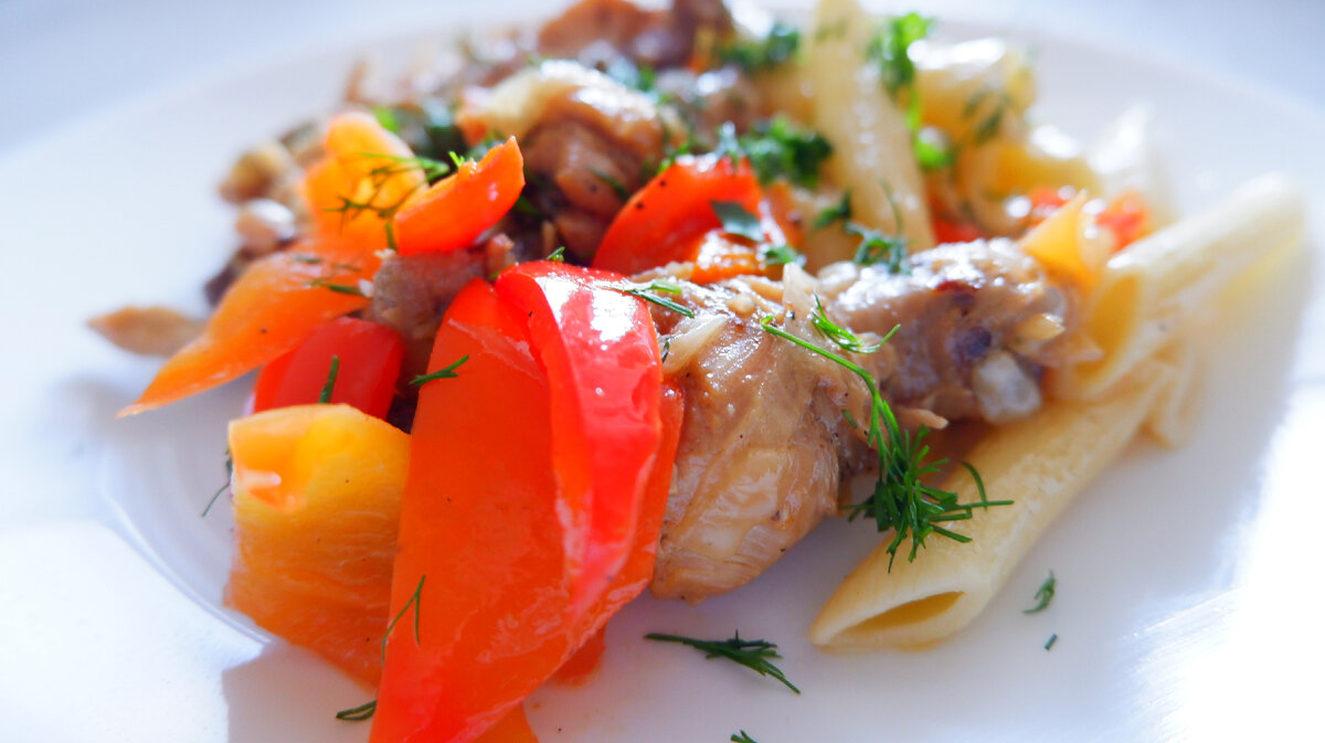 Всем привет! Когда приезжают гости, всегда хочется провести с ними больше времени, уделить внимание каждому, чтобы проведенное вместе время доставило всем положительные эмоции. Поэтому на готовку остается мало времени. 🤔 На этот случай у меня есть совет: куриные окорочка всегда выручат. Они готовятся быстро и просто, это отличная идея не только для повседневного ужина, но и для праздничного стола на скорую руку. Придя с прогулки вместе с гостями, я быстро пожарила окорочка на сковороде и отварила макароны. А для маленького племянника я приготовила розовые спагетти. Получилось весело и аппетитно. 😋 Ингредиенты: Куриные окорочка Лук Морковь Болгарский перец Соевый соус Растительное масло Соль, перец, зелень Для гарнира: Спагетти Свела вареная 1. Мясо птицы я помыла и обсушила салфеткой. Был опыт, когда при жарке вода попадала на раскаленное масло, и было похоже на взорванную в сковороде петарду. 🤯 2. Натерла окорочка солью, перцем и соевым соусом. 3. Нарезав лук