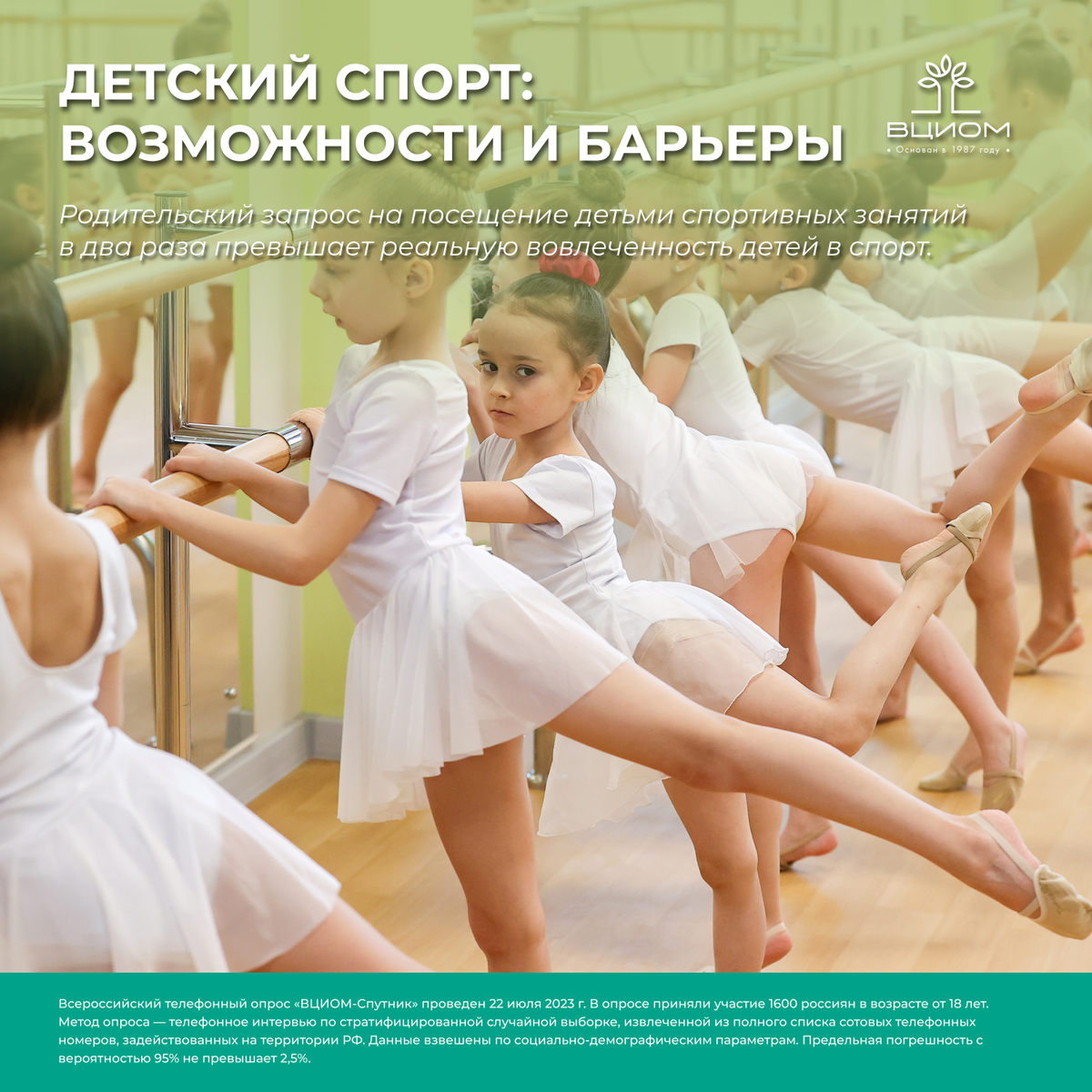 Родительский запрос на посещение детьми спортивных занятий в два раза превышает реальную вовлеченность детей в спорт. Большинство родителей несовершеннолетних детей хотели бы, чтобы дети занимались спортом (82%). Чаще всего родители хотят, чтобы их дети ходили на плавание (28%) и единоборства (27%). Сообщили, что их ребенок посещает дополнительные физкультурно-спортивные занятия и секции, помимо уроков физкультуры в общеобразовательных учреждениях, 45% родителей несовершеннолетних детей. Топ-3 самых популярных видов спорта, которыми занимаются дети: 1. Единоборства (11%); 2. Плавание (10%); 3. Хореография, танцы (8%). В целом россияне возлагают надежды на развитие детского спорта преимущественно на государство — 81%.
