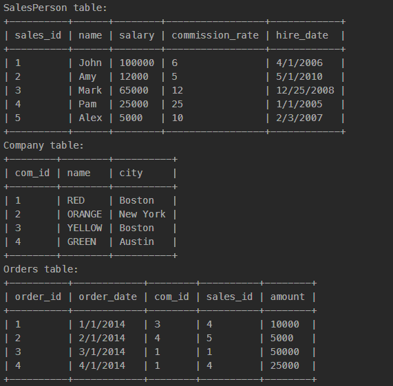 Дано: Таблица: SalesPerson sales_id - это первичный ключ (столбец с уникальными значениями) для этой таблицы.