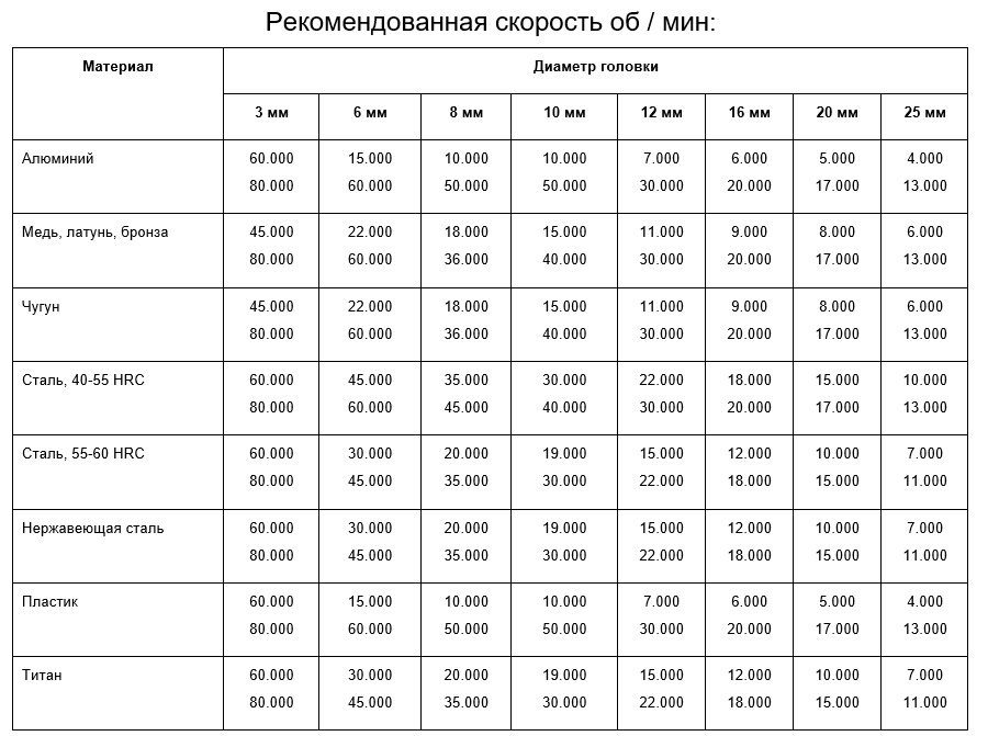 Рекомендации по применению скоростей оборотов твердосплавных борфрез по металлу