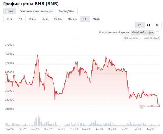Собственный токен BNB Chain (BNB) опустился до самых низких за последние 12 месяцев ценовых уровней. На момент публикации 21 августа 1 BNB равнялся $ 207,47, превысив предыдущий минимум в $ 227,85 от 17 декабря 2022 года. Наиболее агрессивное падение криптовалюты началось 5 июня после объявления дела SEC против криптобиржи Binance, на которой BNB выступает в качестве токена-утилита. При прямой связи с централизованной биржей новости и события, связанные с Binance, часто влияют на цену BNB. За прошедший год BNB потерял более 30% стоимости и занимает 4-е место по рыночной капитализации с $32 млрд. За последние 7 дней BNB зарегистрировал потери 13% и 14% убытков за последние 30 дней, поскольку «страхи, неуверенность и сомнения» (FUD) в отношении финансового состояния Binance растут. График цены BNB за 1 год. Источник: CoinGecko 21 августа пользователи начали жаловаться на невозможность вывода или внесения евро (EUR) на криптобирже. В аккаунте службы поддержки Binance (@BinanceHelpDesk) со
