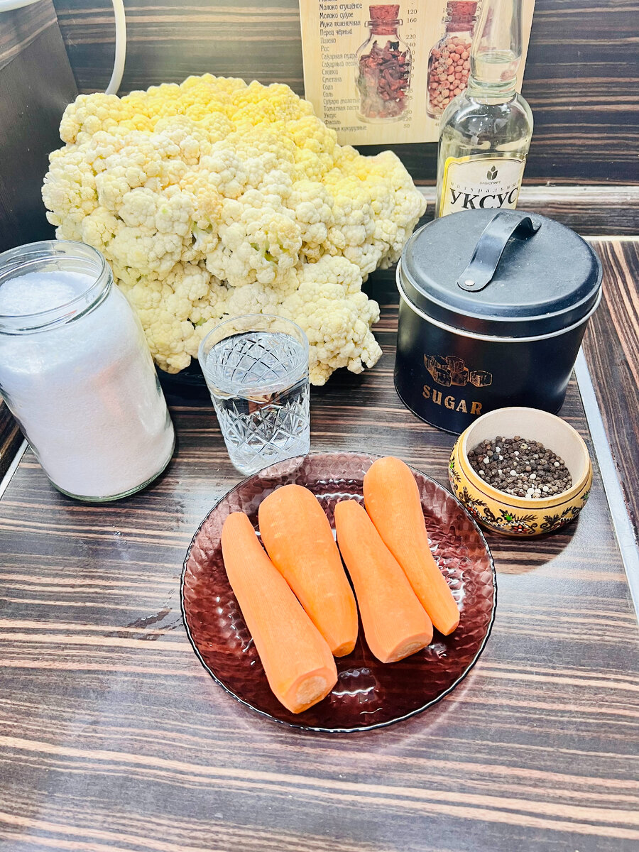 Всем привет!))) Ну что, как и обещала, продолжаю публиковать рецепты заготовок на зиму. И сегодня хочу поделиться еще одним любимым рецептом нашей семьи-маринованной цветной капустой. Этот рецепт действительно обалденный. Капустка получается обалденной-хрустящей, пряной, остренькой и точно произведет фурор на Вашем столе. Такую баночку и на праздничный стол поставить не стыдно, да и просто открыть к обеду или ужину. Я ее однажды на работу принесла к столу, что-то мы отмечали, уже не помню, но потом на каждое застолье меня просили обязательно ее предоставлять, так она всем понравилась))) Итак, для приготовления мне понадобится: Эти пропорции рассчитаны на четыре баночки 0,75 л. У меня баночки были литровые, да и капусты целых 2 больших вилка, поэтому я сразу умножила пропорции рассола на 2,5. На выходе получилось 7 литровых баночек. Первым делом займемся рассолом. Тут все просто: в кастрюлю добавляем воду, соль, сахар и доводим до кипения. Ну а тем временем, разбираем капусту на соцве