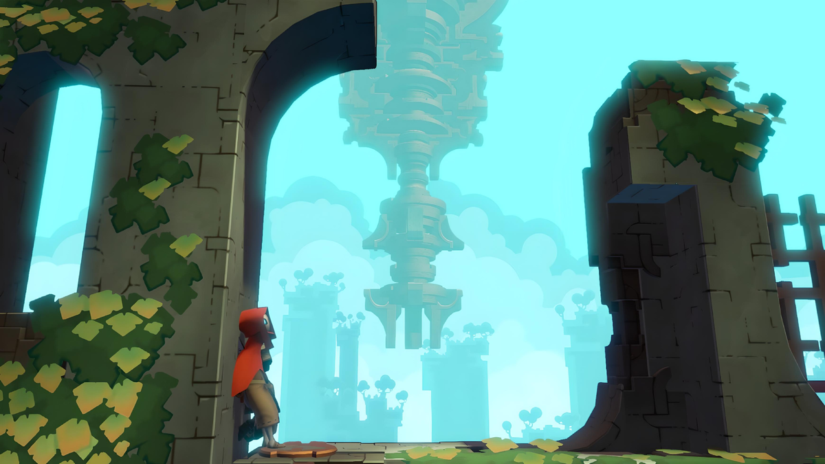 История начинается с освобождения маленького существа в красном плаще и с большими синими глазами. После долгого сна он наконец очнулся и выходит из каменной комнаты в яркий солнечный свет и высокую сочную траву. Рядом с разбуженным стоит большой дружелюбный робот — он-то и выпустил нас на свободу. Молчаливыми кивками и жестами здоровяк подзывает героя поближе, и вот уже управление переходит в руки игрока. Отныне он может идти совершенно куда захочет, ведь направление движения здесь так же не имеет смысла, как в Hyper Light Drifter. И здесь также без слов и полноценных диалогов движется нарратив игры. Мне показалось, что у Hob лучше получается визуально рассказывать свою историю через яркое окружение и конкретные события.