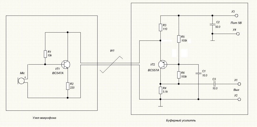 Простые микрофоны, вынесенные на шнуре на расстояние порядка метра и более, подвержены помехам в виде электрических наводок от руки оператора и других узлов. Для борьбы с помехами применяются различные методы. Один из них - "вынесенный усилитель": усилитель, размещаемый непосредственно у микрофона. Вариант схемы приведен на рис.1. Схема состоит из микрофона Mic, узла микрофона на транзисторе VT1, двухпроводного шнура W1 и буферного усилителя на транзисторе VT2. Рис.1.Схема электрическая. Отличительные особенности. Транзисторы устройства включены по схеме единого каскодного усилителя с непосредственной связью и параллельным питанием. Каскодный усилитель разделен на два узла: узел микрофона и буферный усилитель. Шнур W1, соединяющий узлы, передающий сигнал и подающий питание на узел микрофона, выполнен в виде "витой пары", зашунтированной низким входным сопротивлением буферного усилителя, что обеспечивает существенное подавление наведенных помех. Длина шнура может быть много больше