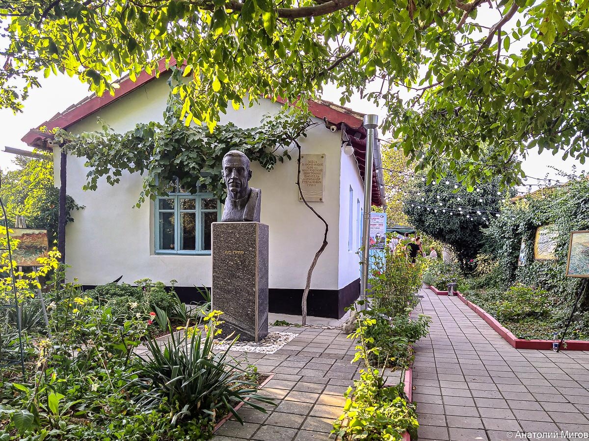 Писатель Александр Грин, автор написавший нестареющие "Алые паруса", свои последние годы провёл в Старом Крыму. Сохранился крохотный домик, в котором жил Грин. Сейчас это мемориальный дом-музей писателя. Каждый год, в день рождения Грина, в Старом Крыму проходит творческий фестиваль "Гринландия" - так давно уже называют вымышленный мир, где живут герои произведений писателя. Традиционно фестиваль открывается во дворе дома-музея. Найти домик Грина легко, к нему ведут указатели. Вчера вечером здесь было много машин - приехали участники и зрители. Скромная деревянная калитка ведёт в тенистый двор. Двор уютный, зелёный и здесь всегда много цветов. День рождения Грина 23 августа, а открылся фестиваль "Гринландия-2023" вчера вечером. Традиционное мероприятие открытия фестиваля называется "Вечер у зеленой лампы". Поклонники творчества Грина знают, что "Зелёная лампа" - это название одного из самых известных рассказов писателя. Вечером во двор дома-музея выносят лампу под зелёным абажуром. А