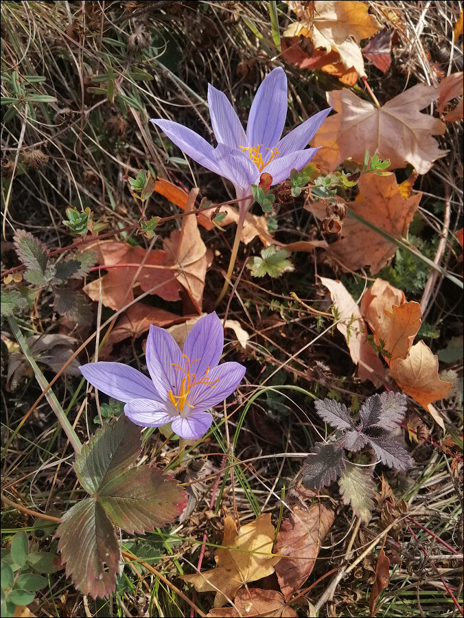 После посещения пещеры Эмине-Баир-Хосар мы запланировали спуститься в Мраморную, которая находится совсем рядом с ней — 1,5 км по прямой, а по дороге раза в два больше. Идти по пыльной грунтовке не хотелось совсем — встречающиеся на ней самосвалы заставили искать на карте альтернативный путь и даже отказаться от геокэшерского тайника близ Мраморной, привязанного почему-то к дороге, а не к пещере. Конечно же прямая тропка-сокращёнка на карте нашлась, и вот мы уже движемся идиллическим полянками по направлению к пещере. Светит солнышко, ветер в лесочке почти не дует, вокруг жёлтые и рыжие деревья, и в жёлтой листве растут крокусы. Очень красиво, очень мило. В лесу тенисто, он засыпан жёлтой листвой. Мы идём, шурша листьями, и от всей души наслаждаемся красотой и комфортом этой чудесной тропки.