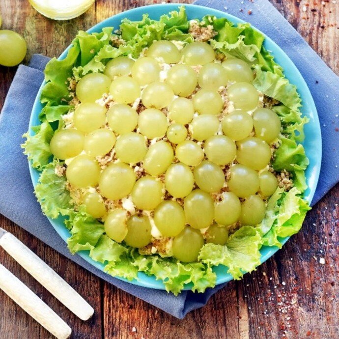 6.Сверху выложить половинки виноградинок по всей площади салата. 7.Можно украсить орехами. Перед подачей отправить салат на 30 минут в холодильник.