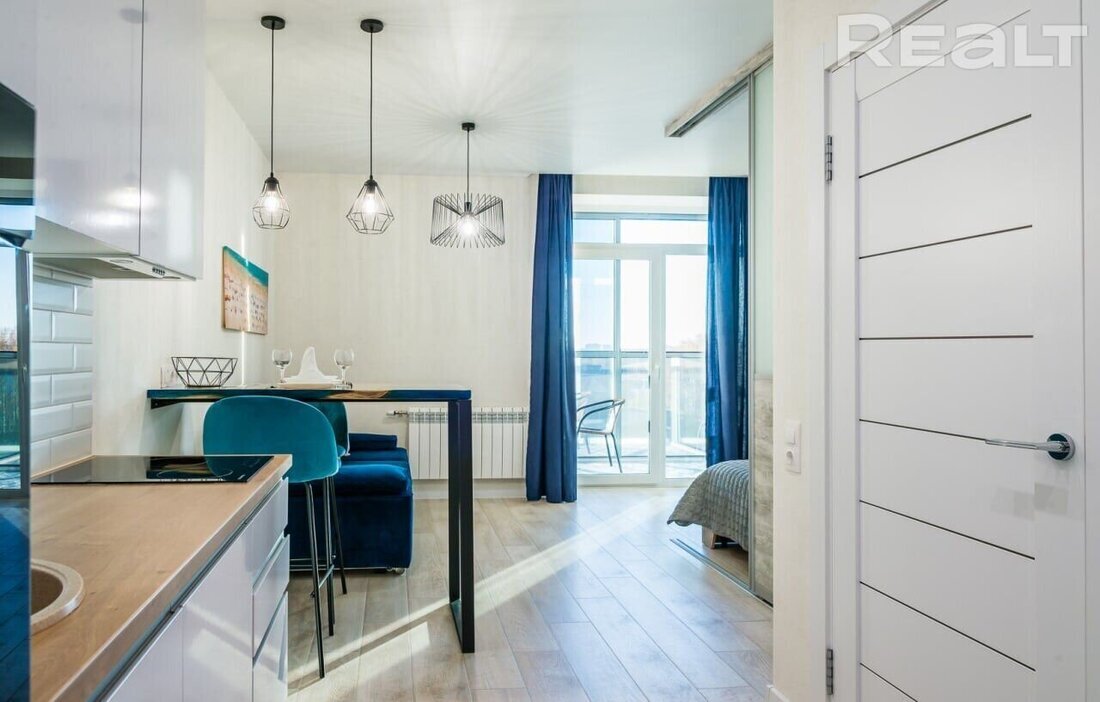 Недавно мы показывали, как выглядит самая дешевая квартира в ЖК «Левада» — она обойдется чуть меньше ста тысяч долларов. Практически столько же стоит и самая дешевая квартира в ЖК D3, но «квадрат» в ней выходит значительно дороже — около трех с половиной тысяч долларов. Показываем этот вариант в подробностях. Самая дешевая квартира с ремонтом в D3 находится на проспекте Победителей, 135Б. Дом стоит на пересечении проспекта и улиц Ратомской, напротив «Олимпик арены» и водохранилища Дрозды. В доме рядом — магазин «Соседи», с другой стороны — «Лодэ». Практически во дворе находится ясли-сад. Это каркасно-блочный дом 2018 года постройки, в котором 26 этажей. Квартира находится на четвертом. В ней 28 «квадратов». На такой небольшой площади получилось грамотно организовать пространство. Вот так выглядит компактная кухня, совмещенная с гостиной. Обеденная зона — за барной стойкой. Из техники есть духовой шкаф, варочная панель, вытяжка, встроенный холодильник и микроволновка. Двуспальная кроват
