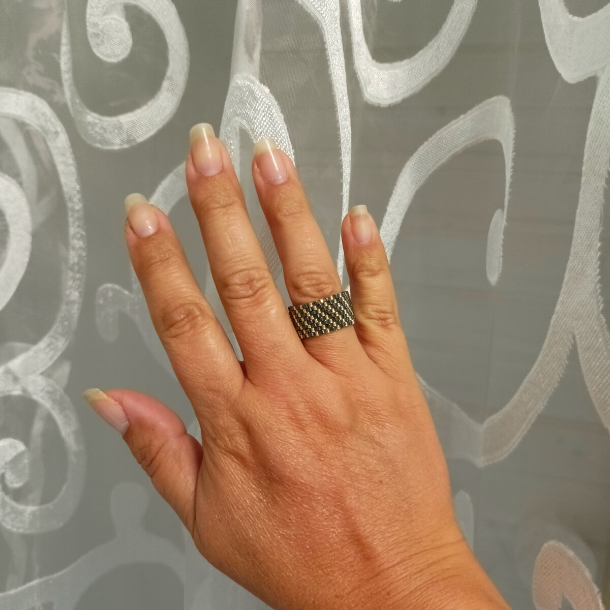Показала готовое колечко мужу. Он сказал: а, серебристое! Но позвольте, какое же оно серебристое?! Чёрное вообще-то оно... и с золотом! Дождь испортил фотосессию, будет возможность, перефоткаю. Никак не могла вначале понять схему, два раза набрала не так... А казалось чего проще : одна бисеринка чёрная, одна золотая - чередуй да и всё! Ан нет... не так всё просто, но я справилась) Мне этот рисунок показался оригинальным. А на ваш взгляд тоже серебристое?) как вам новый дизайн?