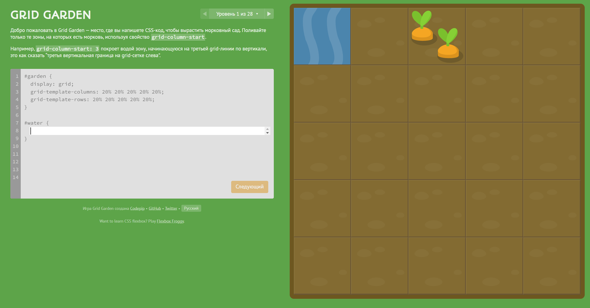 Grid garden Итересный способ изучения. Вам предстоит передвигать воду таким образом, чтобы вся морковь получала воду. В игре доступно 28 уровней, и множество вариантов для прохождения. ссылка на игру Grid attack Эта игра схожа с игрой Flexbox adventure, о которой я писал в прошлом посте. Но здесь вы уже будете прокачивать навыки css grid. Вы должны использовать css grid чтобы изменить землю, благодаря которой демоны не выживут и вы спасете человека. В игре 80 уровней, за эти 80 уровней я уверен что вы что-то точно узнаете новое, либо же закрепите старое. ссылка на игру Css dinner В этой игре мы уже будем использовать чистый css. Здесь вы узнаете о новых селекторах css. В игре 32 уровня и красивые анимации, смотря на свои ошибки вы будете знать на какие селекторы вам стоит ориентироваться. ссылка на игру Guess css Эта игра схожа с css diner, но здесь другой принцип. Вам нужно угадать какой селектор используется в результате, который вы видете. Игра не ограничивается конкретными ча