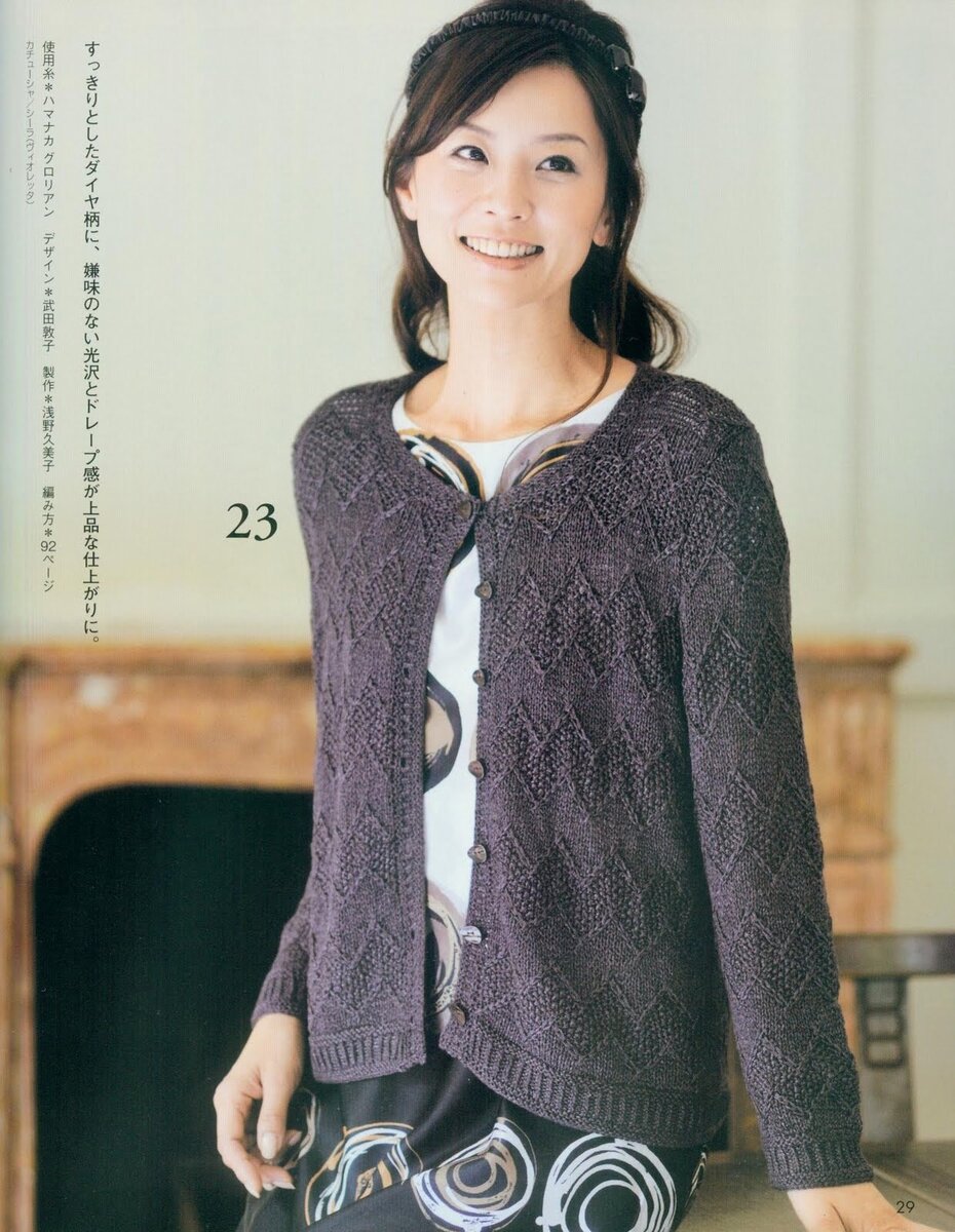 Размер 38/40 Вам потребуется: пряжа Stahl "Bari" (51% хлопка, 49% полиакрипа; 145 м/50 г) - 600 г белой; спицы № 3 и 3,5; круговые спицы № 3 длиной 120 см; 6 пуговиц. Платочная вязка: лицевые и изнаночные ряды - лицевые петли. Ажурный узор: вязать по схеме. Числа справа обозначают лицевые ряды, числа слева - изнаночные ряды. В ширину повторять раппорт между стрелками а и b, распределение узора приведено в описание деталей. Повторять с 1-го по 24-й ряд Плотность вязания: 20 п. х 40 р. = 10 х 10 см, связано ажурным узором. Спинка: набрать 115 п. на спицы № 3 и вязать для нижней планки 3 см = 15 р. платочной вязкой. Продолжить работу ажурным узором спицами № 3,5 кром., 14 раз повторить раппорт между стрелками а и b, закончить петлей после стрелки b и кром. Через 43 см = 172 р. oт нижней планки сделать с обеих сторон по метке. Через 24 см = 96 р. от меток закрыть для горловины средние 23 п. и обе стороны закончить раздельно. Для закругления выреза закрыть с внутреннего края в каждом 2-м р. 1 раз 3 п. и 1 раз 2 п. Через 26 см = 104 р. от меток закрыть оставшуюся 41 п. плеча. Левая полочка: набрать 55 п. на спицы № 3 и вязать для нижней планки 3 см = 15 р. платочной вязкой. Продолжить работу ажурным узором спицами № 3,5: кром.. 4 п. от стрелки с до стрелки а, 6 раз повторить раппорт между стрелками а и b, закончить петлей после стрелки b и кром. Через 43 см = 172 р. от нижней планки сделать с правого края метку. Через 46 см = 164 p. от нижний планки закрыть с левого края для скоса выреза 1 п., затем еще 13 раз по 1 п. в каждом следующем 6-м р. Оставшуюся 41 п. плеча закрыть на той же высоте, что и на спинке. Правая полочка: вязать симметрично с распределением узора, как на левой полочке. Рукава: набрать 51 п. на спицы № 3 и вязать для нижней планки 3 см = 15 р. платочной вязкой. Продолжить работу ажурным узором спицами № 3,5: кром., 6 раз повторить раппорт между стрелками а и b, закончить петлей после стрелки b и кром. Для скосов прибавить с обеих сторон в 7-м р. от нижней планки, затем еще 27 раз в каждом 6-м р. по 1 п. = 107 п., на прибавляемых петлях вязать ажурным узором. Через 45 см = 180 р. от нижней планки выполнить еще 2 р. платочной вязкой, затем петли закрыть. Сборка: детали наколоть на выкройку, увлажнить и оставить до высыхания. Выполнить швы. Для планки застежки набрать на круговые спицы по вертикальным краям полочек по 138 п., по скосам выреза по 75 п. и по краю горловины спинки 52 п. = 478 п. и вязать 3 см = 15 р. платочной вязкой, затем петли закрыть. Одновременно в 8-м р. (= лиц, ряд) на планке правой полочки вывязать 6 отверстий для пуговиц: провязать 3 п., * 3 п. закрыть, провязать 23 п., от * повторить 4 раза, 3 п. закрыть. Вместо закрытых набрать новые петли в следующем изнаночном ряду. Вшить рукава, пришить пуговицы.