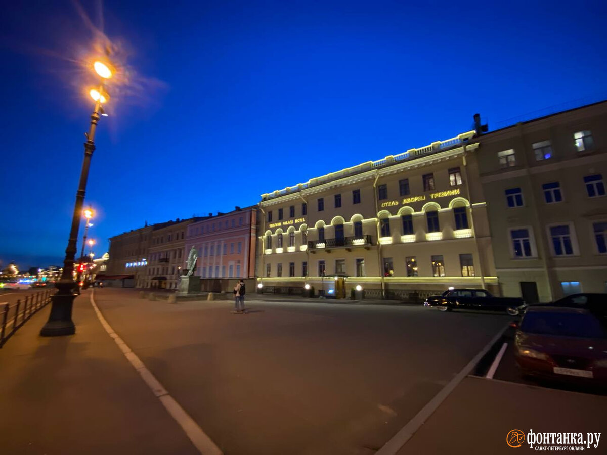 Отель расположен на Университетской набережной. В нескольких окнах горит свет, но понять, что там происходит, невозможно. Адрес — знаковый. Именно там правоохранители искали доказательства по ныне отмененному делу о военном мятеже 24 июня.