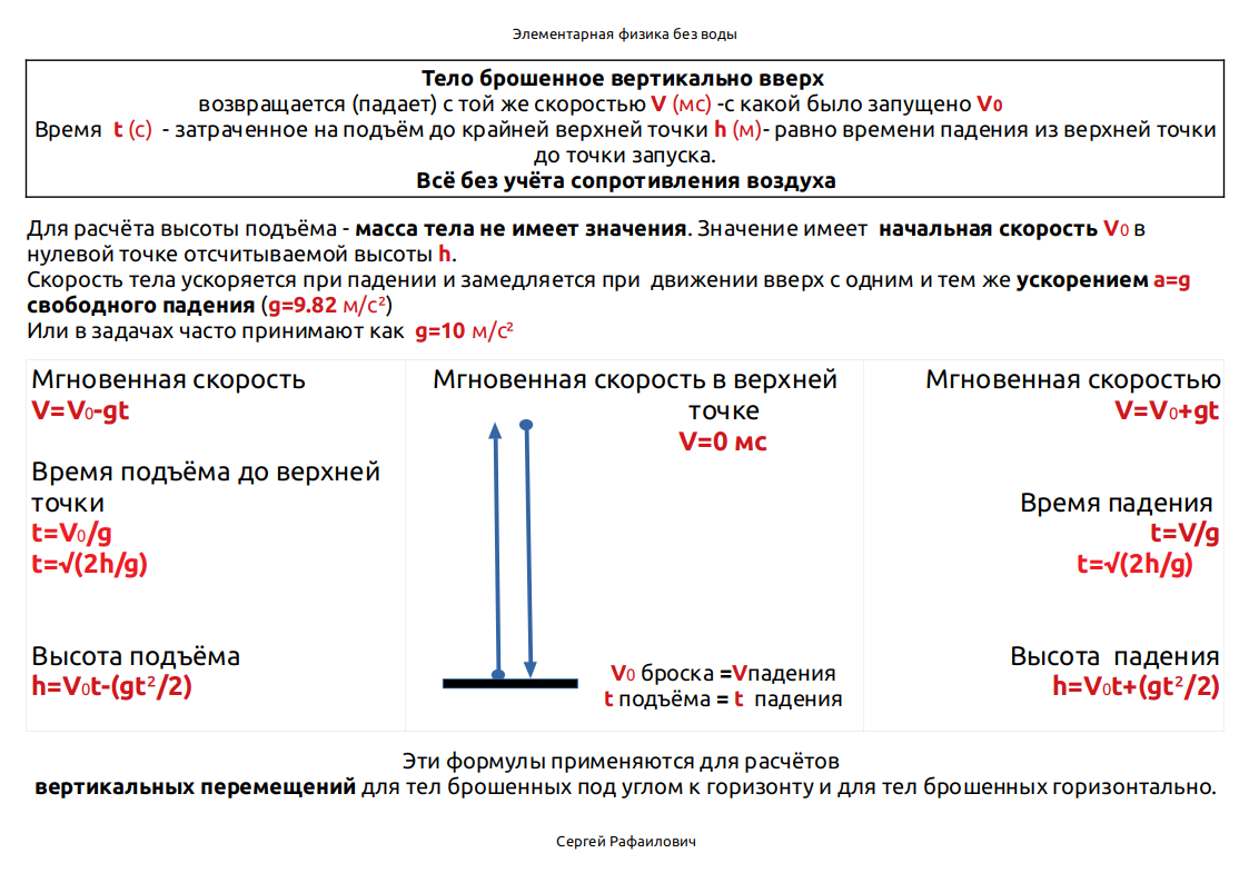 Простой конспект по полёту тела вверх и вниз. Строго вертикально и без учёта сопротивления воздуха и всех других сопутствующих параметров. влияющих на полёт. Слева формулы для расчёта вертикального движения вверх. Справа всё для вертикального падения. Дзинь почти полностью обнулил вознаграждение за посты. Хотите поддержать автора? Просто кликните по этой ссылке. Ничего платить, регистрироваться или делать не нужно. Просто один переход по ссылке и айда назад. Тут ещё не указано, что в первую секунду своего движения вниз из наивысшей точки тело проходит путь равный половине ускорения свободного падения. то есть 1/2g Да. Всё это касается только тела именно брошенного (например пинком) вертикально верх с какой-то начальной скоростью, то есть тело не должно иметь двигателя (например как у ракеты). Уроки 3D моделирования в бесплатных редакторах голосом Сергея Рафаиловича. Технологии создания моделей. И не только.