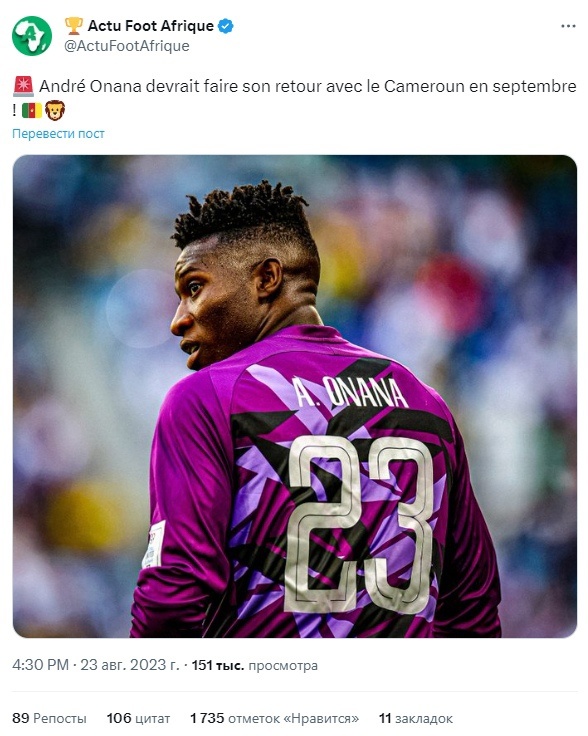 Похоже, Онана решил вернуться в сборную. В таком случае он пропустит сразу несколько матчей «Юнайтед»