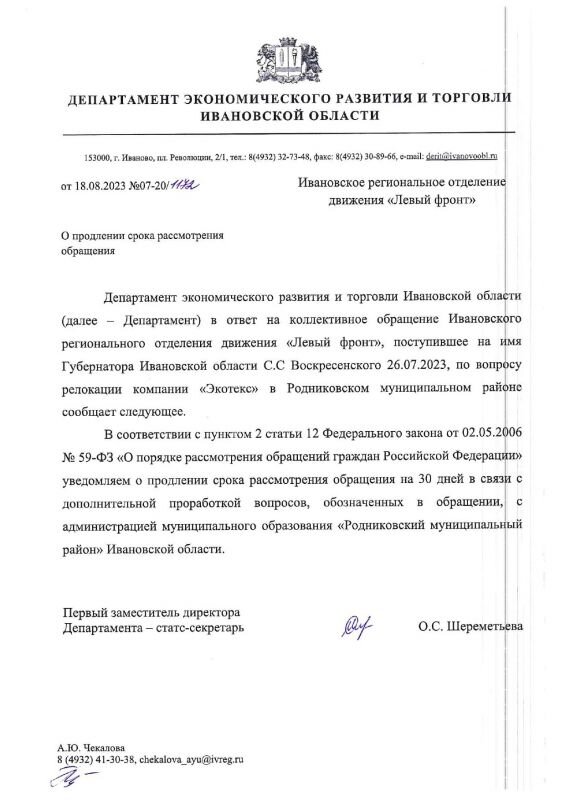 История с переводом вредной части производства компании "Экотекс" из Курска в Ивановскую область получила свое продолжение. Координатор “Левого фронта” в Иванове Илья Журавлев направил запрос в региональный департамент экономического развития и торговли, когда пришел ответ, он посчитал, что представленная информация является недостаточной, и тогда было решено сделать коллективный запрос в форме открытого письма. Его адресовали губернатору Станиславу Воскресенскому и подписали координатор Ивановского областного отделения движения Левый Фронт Илья Журавлев, депутаты Ивановской областной Думы от КПРФ Александр Бойков, Анатолий Тимохин, Павел Смирнов, депутат Шуйской Гордумы от КПРФ Михаил Варенцов, Председатель Ивановского областного краеведческого общества Владимир Возилов. В открытом письме речь идет о недостаточности информации по ситуации с переводом компании “Экотекс” в Ивановскую область (город Родники). Подписавшиеся выдвинули губернатору ряд требований, в их числе: -предоставить п
