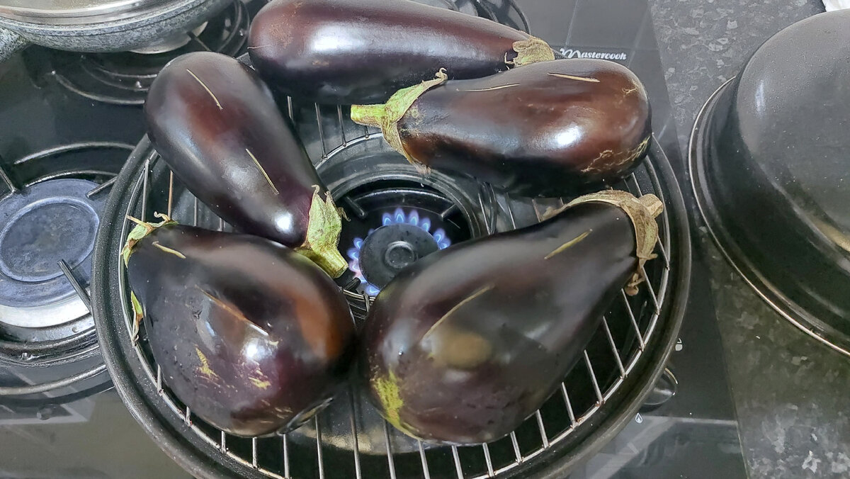 Наверное те, кто любит баклажаны, помнят, насколько они были вкусны, когда пахли дымком. Но к сожалению, по нынешним временам, приходится запекать их в духовках. Я имею ввиду людей, которые живут в многоквартирных домах. Если в советские времена, можно было выйти во двор такого дома и запечь баклажаны и перец, то сейчас это запрещено законом. Но пока закон не запретил вкусные баклажаны с дымком, поэтому я научу вас как их приготовить. ПОШАГОВОЕ ПРИГОТОВЛЕНИЕ: Баклажаны тщательно промываю и выкладываю на сковороду гриль. Кстати, многие скажут, что можно просто поставить металлическую пластину на плиту и запекать на ней. Будьте внимательны, так можно испортить плиту из-за жара, который возвращается на ее поверхность отражаясь от пластины. На баклажанах обязательно делаю надрезы, иначе они могут "взорваться" в самый неподходящий момент и можно получить ожог. Включаю плиту и накрываю сковороду крышкой. Периодически проверяю баклажаны на готовность. По квартире уже доносится запах дымка о