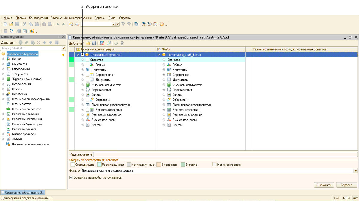 Для объединения ФГИС "Меркурий" с рабочей конфигурацией выполните следующие действия: 5. Отметьте по подсистемам файла. 6. Выберите подсистему ВСД, установите ее. 7. Для объединения конфигураций воспользуйтесь кнопкой "Выполнить". 8. Далее примените все изменения, нажав на кнопку “Принять”. Установка завершена.