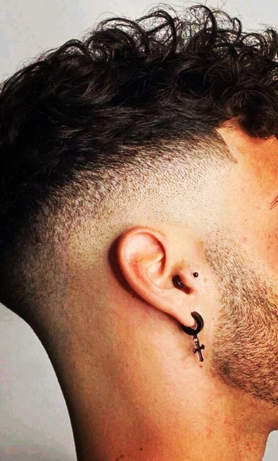 Бритый затылок, хвостик и серёжки. Вполне брутальный образ.