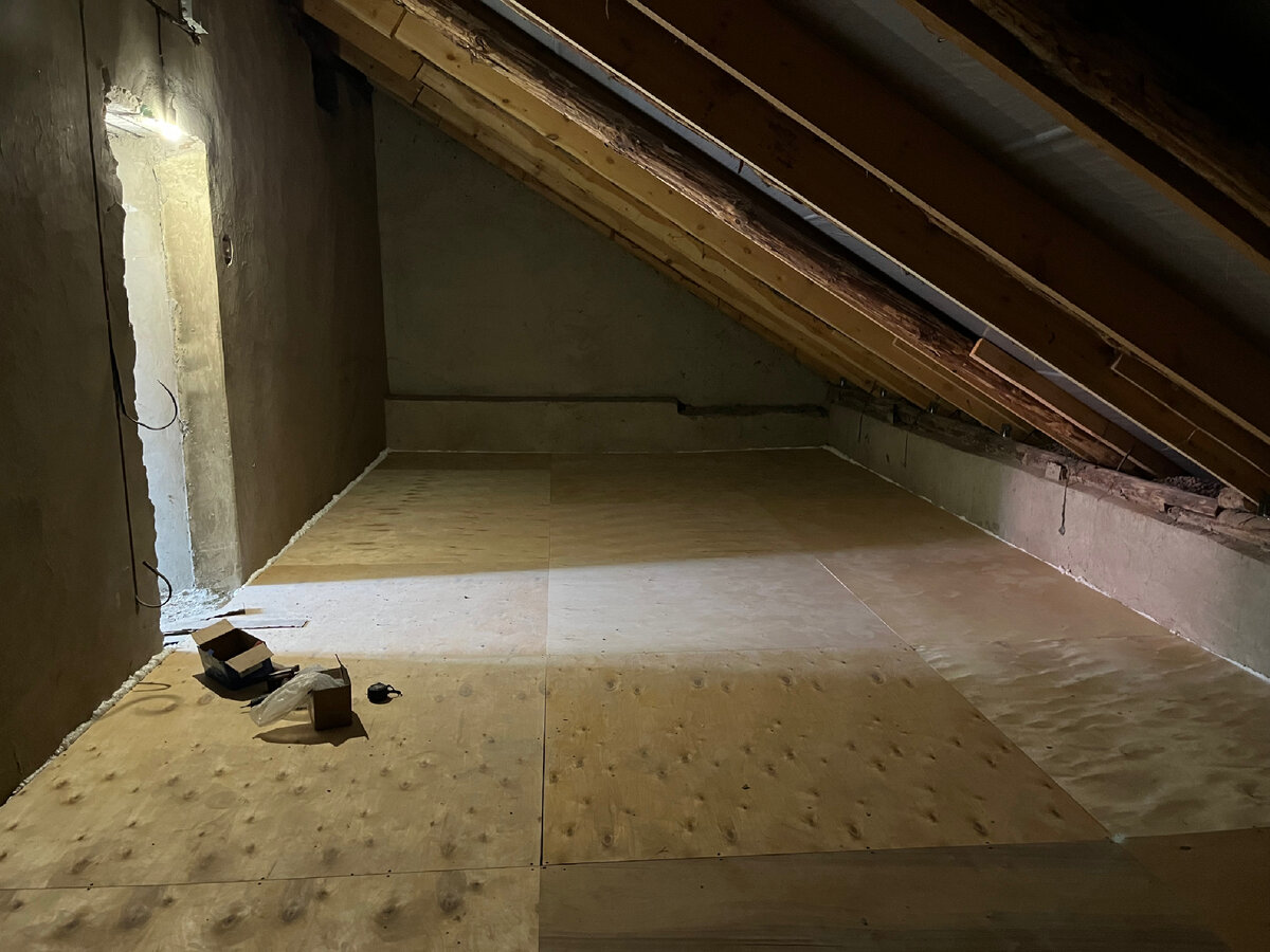 Изначально на этом чердаке было утепление керамзитом. Но он был насыпан по углам, в середине пустота. Его, видимо, прежние хозяева дома убрали с середины из-за того, что ходить неудобно и дверь толком не откроешь.