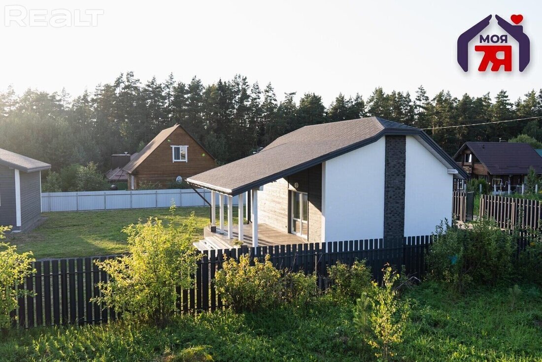 Не доезжая до МКАД-2, рядом с рекой Ислочь, продается новая дача с отделкой внутри. В дом можно приезжать не только в летний сезон, но и оставаться зимой. Для этого там созданы все условия - отопление и круглогодичная вода. Посмотрите, как выглядит дом с баней за 69 900 долларов. Дом находится в СТ "Родник-2009" в Минском районе. Его построили в 2019 году из профилированного бруса толщиной 200 мм. Стены дополнительно утеплили минеральными материалами, обшили имитацией бруса. Крыша - гибкая черепица. Общая площадь дома - 62,7 м². В доме есть большая гостиная с выходом на террасу, спальня, кухня, прихожая и совмещенный санузел с душевой кабиной. В жилых комнатах лежит ламинат, в прихожей и санузле - плитка. Отапливается дом с помощью газового котла. Также в комнатах стоят радиаторы отопления, установлены энергосберегающие стеклопакеты. Вода здесь круглогодичная, поступает из центрального водопровода. Канализация - местная. Рядом с домом построена и баня с парилкой, комнатой отдыха, сануз