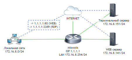 В офисе работает некий WEB сервер и терминальный сервер с доступом из дикого интернета при помощи проброса порта на роутере. Фишка в том, что по внешней ссылки из локалки сети того же роутера попасть невозможно. Для решения будем использовать NAT LoopBack - прием и отправка пакетов через один и тот же интерфейс, с подменой локальных и внешних адресов в обе стороны. Создаем привычный проброс порта для нашего WEB сервера Создаем правило для перенаправления запросов по внешнему IP из локальной сети Chain - dstnat