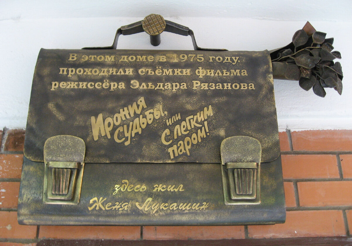 3-я улица Строителей, дом 25, квартира 12 – адрес, знакомый без преувеличения каждому из нас, адрес, прославленный Эльдаром Рязановым в бессмертной новогодней комедии «Ирония судьбы, или С легким паром!». Но далеко не все знают, что прототипы домов, где жили главные герои фильма, Надя Шевелева и Женя Лукашин, расположены в нескольких сотнях метров друг от друга, в Москве, на проспекте Вернадского, дома 113 и 125. В 2003 году на стене дома, где жил Женя, была установлена мемориальная табличка, торжественно открытая при участии Эльдара Рязанова, но украденная на следующий же день. А спустя еще четыре года памятные знаки появились сразу на двух домах и представляли собой металлические портфели с торчащими из них банными вениками и надписями о том, что в этих домах проходили съемки фильма. Отличия заключались лишь в нижней подписи, сообщающей, кто из героев жил в данном подъезде. Увы, но табличка с дома Жени (на фото выше) вскоре вновь была украдена, а вместо нее в итоге повесили ее фотографию, но зато женин портфель, висящий около подъезда Нади, по-прежнему на своем месте.