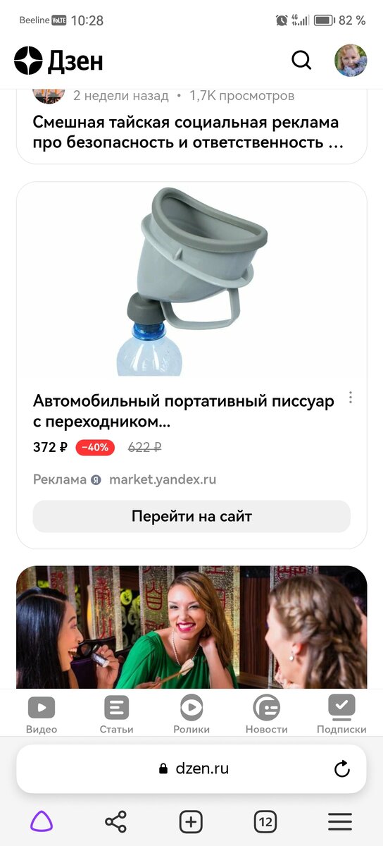 Все мы знаем, что реклама подбирается исходя из интересов запросов, переходов и поисковых систем. Что мы ищем, о чем даже говорим, то потом нам в рекламе и вылезает. Я читала про Крым, смотрела фото и даже билеты в Сочи смотрела. Это у меня был релакс такой пару вечеров. Что можно было ожидать в рекламе? Туры, билеты, отели и что-то подобное. Вчера вылетела реклама круиза на Валаам, я даже призадумалась, а почему бы и нет. А сегодня с утра нет, не будет вам прекрасного. Я думала случайно, а сейчас опять Дзен открыла, а там: Скрин появившейся рекламы. Я даже не поняла сначала, о чем это. Хорошо не полезла по ссылке, а то боюсь потом ленту увидеть. А может надо мне, а я пока не знаю об этом. Как там он называется, а вот "портативный писсуар с переходником". Как вам эта тема? Актуальна? Хочу рекламу путешествий, красоты, да даже на товары для рыбалки согласна, что часто у меня вылетает, да разные товары типа обуви или платьев. Откуда такое чудо вылезло, не знаю. Но повеселило. Я сег