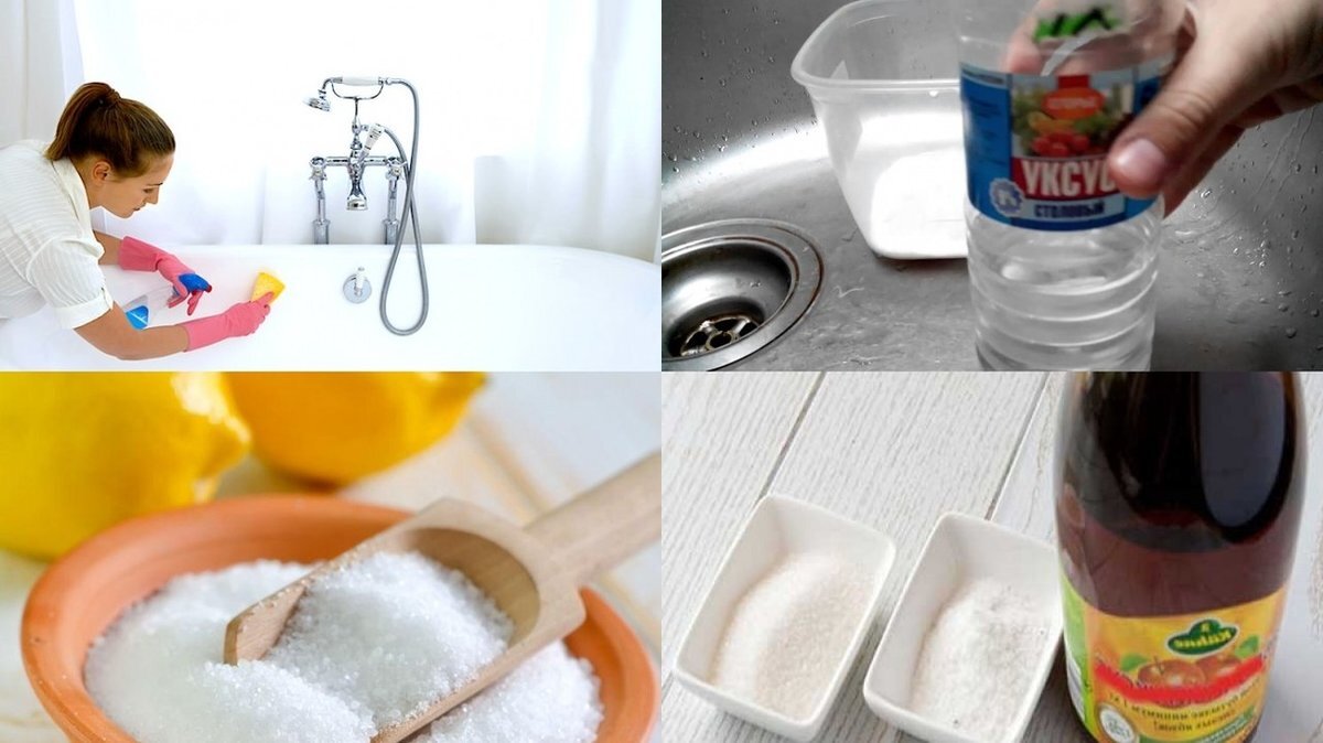 Перекись водорода (H2O2) — эффективное средство для удаления известкового налета, обесцвечивания и тусклости поверхностей ванн. Используя распылитель для распыления перекиси водорода на целевые участки, ее омолаживающий эффект будет максимальным, если дать ей отдохнуть в течение тридцати минут перед ополаскиванием теплой водой. Другой метод включает в себя наполнение ванны пищевой содой (NaHCO3) и последующее добавление уксуса (CH3COOH) через несколько минут. Аккуратная чистка поверхности ванны подходящей щеткой и ополаскивание теплой водой удаляет грязь и восстанавливает первоначальный блеск ванны. Устойчивое пожелтение можно эффективно устранить применением водного раствора лимонной кислоты (C6H8O7). Соединив один пакетик лимонной кислоты с одним стаканом воды, полученную смесь можно нанести на пораженные участки с помощью губки. Дайте раствору впитаться в течение двадцати минут, затем смойте теплой водой. Первозданную и сияющую ванну можно получить, смешав в равных пропорциях уксус (CH3COOH) и соль (NaCl), а затем нанеся смесь на поверхность ванны.