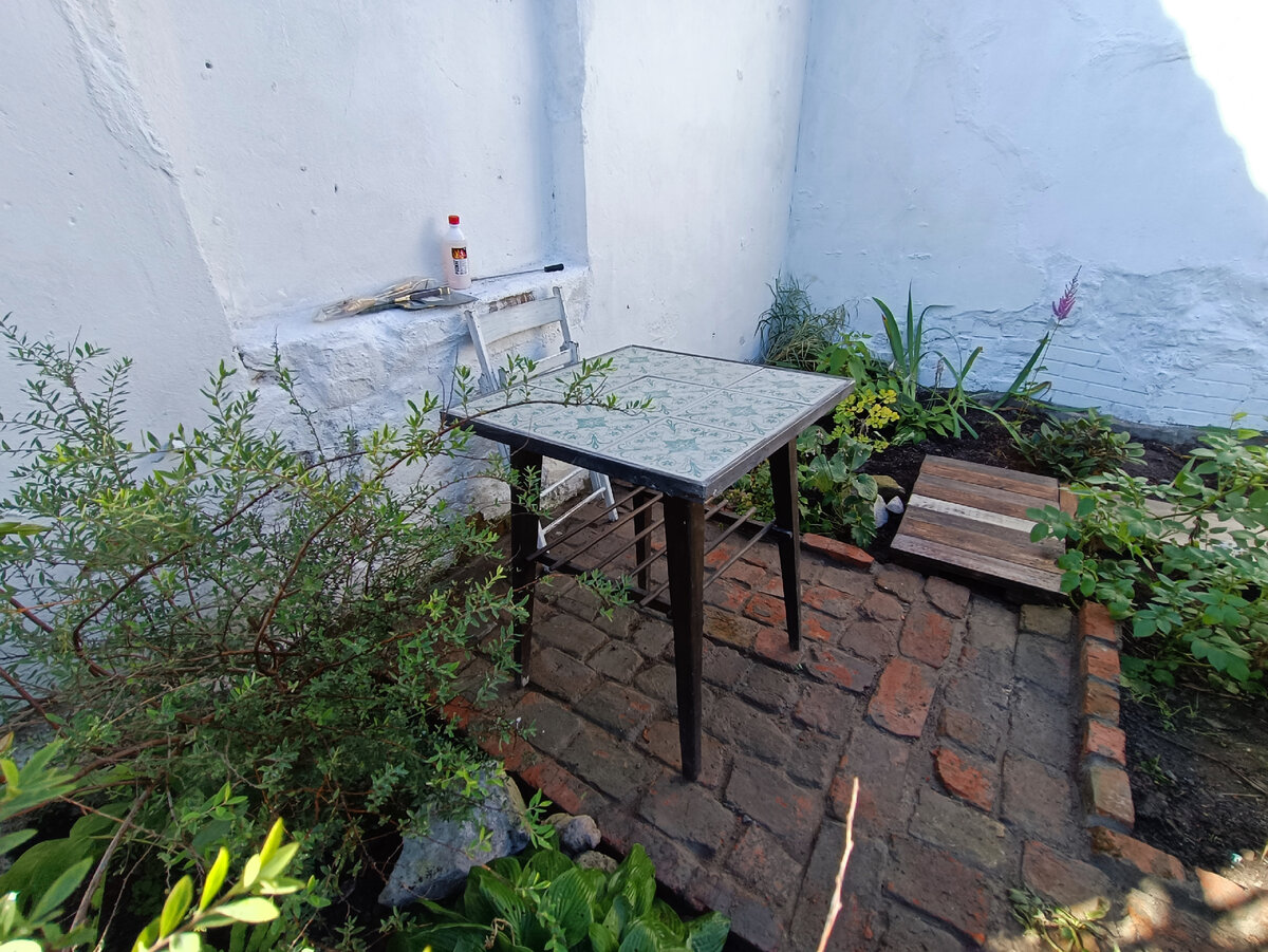 Мои постоянные читатели помнят, что в прошлом году я восстановила спасённый с мусорки столик. Специально для мангальной площадки - её не было еще и в помине, а стол был уже сделан. Я люблю опережать события🤣 Так что покончив со строительством основной мангальной площадки решила я добавить к ней аппендикс специально для столика - удобно же иметь столик для продуктов, которые собираешься готовить на мангале. Не на лавочку же их ставить. Тем более мне еще и клумбы надо было обрамить, и подход к будущему мангальному шкафчику сделать, и от строительного мусора продолжать избавляться. Как и основную площадку, дополнительную я решила замостить старым советским кирпичом. Принцип стройки был тот же: сначала сняла грунт, затем засыпала основание битым кирпичом. Затем выровняла площадку слоем песка и стала укладывать на него свои кирпичи. В этот раз, проведя работу над ошибками, бортик было решено делать из кирпича, ставя его вертикально, на торец. Под "бортики" раствор, чтобы кирпич мо