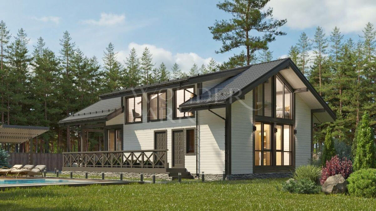 Возможна разработка индивидуального дизайна парного отделения с использованием элитных пород древесины и современных дизайнерских решений. Проект современной бани в стиле с фахверк. Несущий каркас выполнен из клееного бруса, стены утеплены и отделаны деревянной отделкой. Отличительной особенностью стиля фахверк - панорамные стеклопакеты установленные без рамы в несущий каркас. Идеальное решение для любителей современной красивой архитектуры. Проект может быть изменен, исходя из ваших предпочтений и дополнен:террасой с барбекю-комплексом,