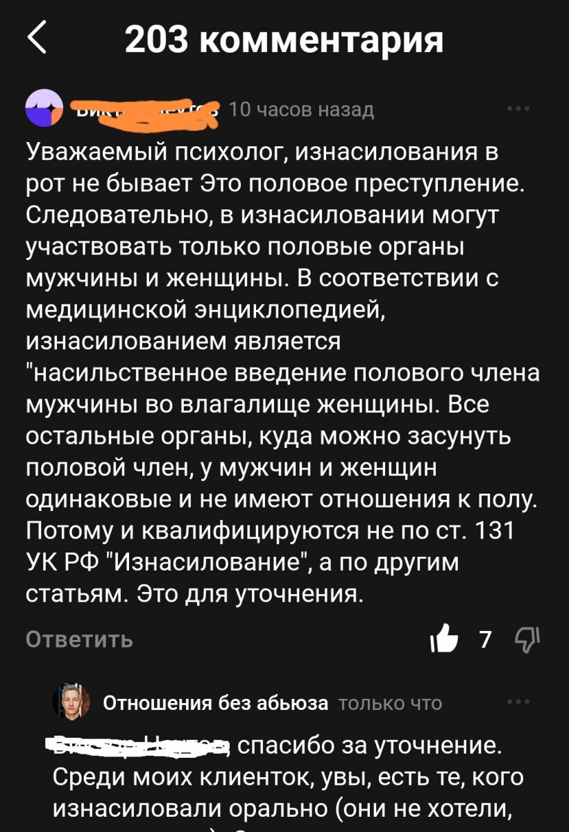 Является ли принуждение к половому сношению женщины с использованием психологического насилия основанием к возбуждению дела по статье 131 УК РФ «Изнасилование»? Неприятная тема, которую я решился осветить после комментария. Получил его по статье «Не соглашайтесь на оральный секс» (опубликованного на канале Dzen сайта b17). Мужчина написал: «Изнасилования в рот не бывает…» и так далее. Смотрите! По первому высшему я юрист. Работал по специальности некоторое время (без энтузиазма), даже в суде выступал (по гражданским делам). Поэтому получив замечание полез в нормативные документы. Нормы по изнасилованию Статья 131 УК РФ даёт такое определение: «Изнасилование, то есть половое сношение с применением насилия или с угрозой его применения к потерпевшей или к другим лицам либо с использованием беспомощного состояния потерпевшей». (скрин того комментария, что сподвиг меня написать этот материал) Насилие (по данным Консультант Плюс) – опасное, так и не опасное для жизни или здоровья принуждение