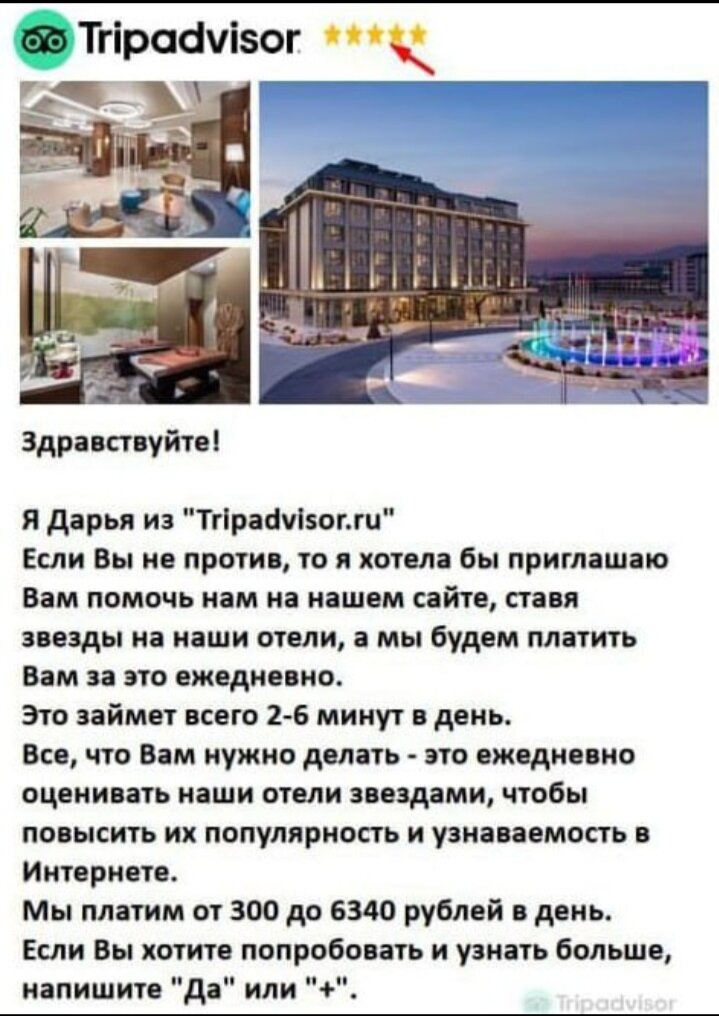 Рассказываю подробно, т.к. сама в этом разводе поучаствовала. Спойлер - деньги не потеряла. Для непосвящённых. Я обычная, работающая, как папа Карло, мать. Кровной дочери Дюхе (Наде) - 28 лет, усыновленному сыну Жоре 2 года, на подходе ещё один ребенок, ждём аиста. Пишу тут обо всем. В мой Телеграм от незнакомой Дарьи приходит сообщение-картинка с предложением подработать. В картинке ошибки, которые я сначала даже не заметила. Еще бы! Там же неплохая оплата за несколько минут работы в сети. А надо сказать развод построен очень красиво, со знанием психологии человека. Вот какая потребность у человека, который согласен на подработку? Конечно же деньги! Ну, а доверие вызывает прочий атрибут - куча менеджеров, которые по любому вопросу переключают тебя то на одного, то на другого специалиста, тестовое задание, за которое платят. Мне, кстати, заплатили 400 рублей. Вызывает доверие. Заплатили за то, что я заходила по их ссылкам, делала скриншоты отелей и высылала менеджеру. Ну, плевое же