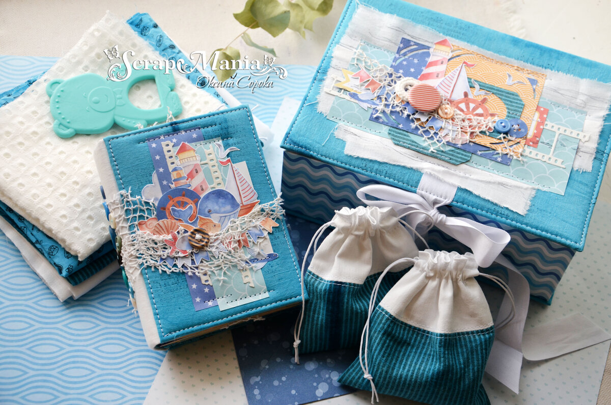 Всем большой творческий привет! На связи Оксана Сорока с детским вдохновением из коллекции "Морячок" У меня тут целая коробка сокровищ: блокнот для записей и фото малыша, и милейшие мешочки для хранения приятных мелочей. Ну что, приступим?! Сначала смотрим фото. Шкатулка очень вместительная - внутри уместились блокнот и мешочки для хранения мелочей. Коробочка обтянута хлопком и скрапбумагой, на крышке многослойный декор, закрывается/завязывается на ленту На внутренней стороне крышки можно разместить фото 7.5х10см. Тканевые флажки прекрасно дополняют многослойный декор из бумаги, внутри самой шкатулки мягкое тканевое донышко) А вот и "жители" моей шкатулочки - пухлый блокнотик и два мешочка Давайте посмотрим внутренее наполнение блокнота. Внутри не только страницы для записи, но и множество мест для фотографий и кармашки. В декоре использованы не только вырезные элементы и вырубку, но и карточки из набора. Нож "кинопленка со знаками" прекрасно смотрится во многих композициях, а ткане