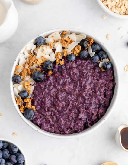 Этот рецепт овсянки с черникой - идея для здорового завтрака! Он веганский, без глютена, без молочных продуктов и рафинированного сахара. Добавление черники превращает скучный бежевый оттенок каши в великолепный фиолетовый. А когда ваш завтрак яркого цвета, вам гарантировано счастливое начало дня! Такой завтрак также богат клетчаткой и насыщен витаминами и минералами. Каждая порция овсянки с черникой содержит 217 калорий, 4 гр. жиров, 39 гр. углеводов, 6 гр. белка и 5 гр. клетчатки. Вы можете каждый раз менять этот рецепт, добавляя разные добавки. Попробуйте один из вариантов ниже. Ингредиенты: Способ приготовления: 1. Смешайте все ингредиенты в небольшой кастрюле. 2. Переставьте кастрюлю на плиту и готовьте на среднем или сильном огне. Часто помешивайте овсянку, чтобы она не прилипала ко дну. Готовьте, пока ягоды не загустеют и не станут кремовыми, около 7–8 минут, разминая чернику. 3. Переложите овсянку в тарелки. Добавьте свои любимые топпинги, такие как свежие фрукты, ореховую пас