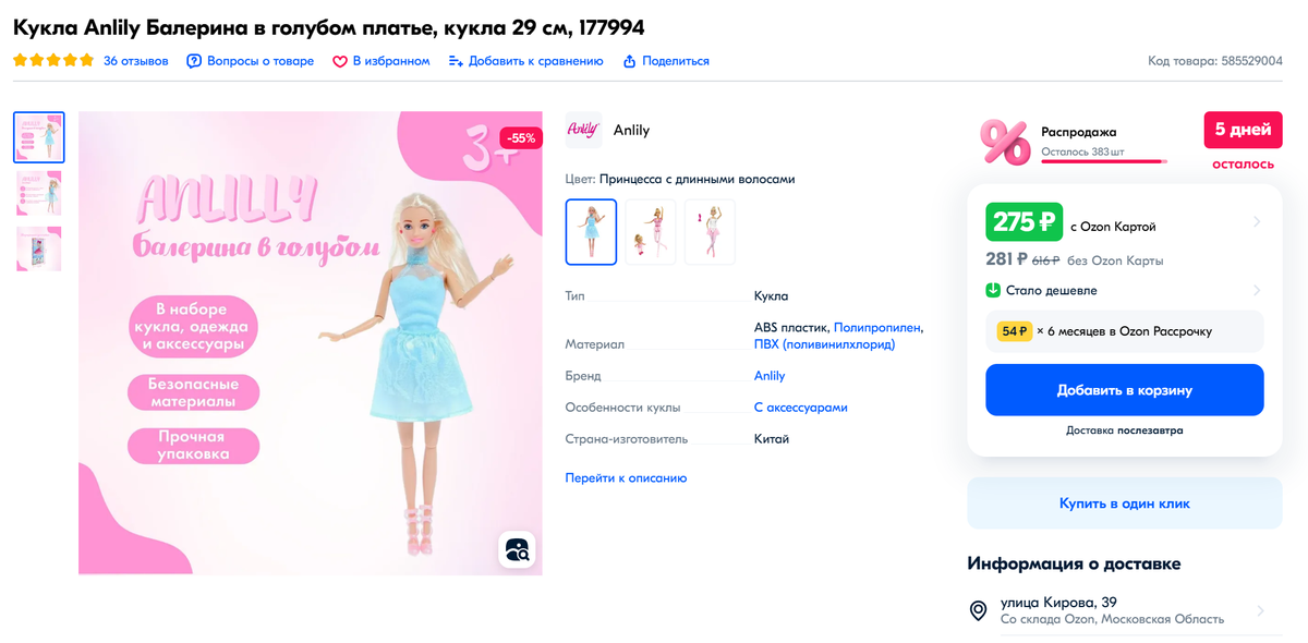 Как любитель потрошить аналоговых кукол, я не могла пройти мимо новой для меня куклы Анлили. Рассматривая на Озоне самые разные кукольные товары, я вдруг наткнулась на очень бюджетный и интересный вариант куклы формата Барби. Цена за куклу совершенно смешная. Меня заинтересовало личико куклы и ее тельце. Основная масса этих кукол выпускается без шарнирного тела. Шарнирных вариантов очень не много. Еще один я хочу приобрести тоже, поскольку он идет с мебелью. А это мне всегда интересно. Вот такой аналоговый десант ко мне прибыл. Плюс еще шикарный шарнирный парень, которого мы смотрели в предыдущем обзоре "Самый бюджетный "Кен". Коробка у Анлили закрытая, нет окошка чтобы увидеть куклу. Задник с куклой выдвигается из глухой коробки. Все оформлено красиво. Девочке в подарок самое то! Внутри нас ждет красотка-балерина с очень нежным личиком. У моей есть брак прошивки - сбоку на лбу есть фрагмент ряда допрошитых волос. Печать лица ровная, красивая и очень милая. В ушках розовые сережки. На