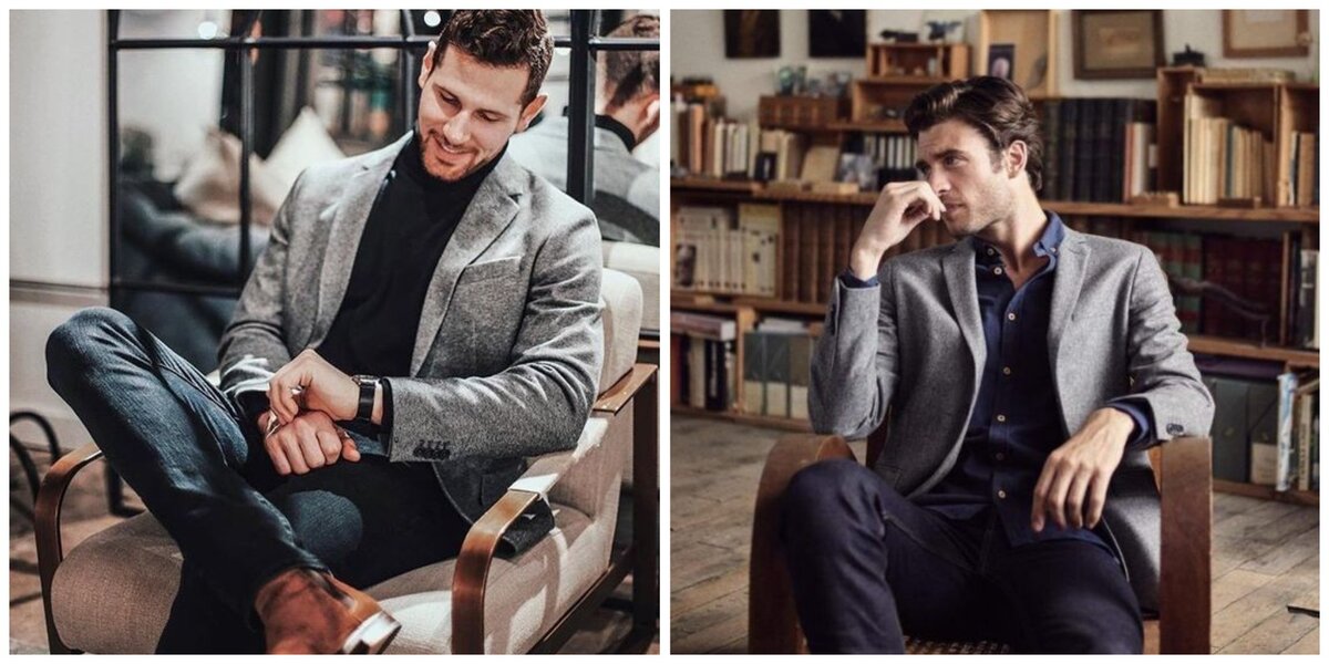 1. Классический серый или тёмно-синий костюм (2 шт.). По желанию заменяем на коричневый/зелёный/чёрный, но учтите, что чёрный в наших реалиях это торжественность и официоз, а зелёный и коричневый - неформальность. Яркие костюмы к деловому стилю не относятся. 2. Белая сорочка. 1-3 шт. Минимум одна быть должна, даже если не носите их в повседневности. Она может добавить торжественности и формальности при необходимости. 3. Несколько пастельных или светлых сорочек. Можно 1-2 тёмных, базового цвета, но они менее универсальны и формальны, чем светлые. 4. Тренч, пальто или удлинённая куртка прямого силуэта. Требование она должна закрывать пиджак. 5. Классические тёмно-синие джинсы или чинос (слаксы). 1-2 пары.