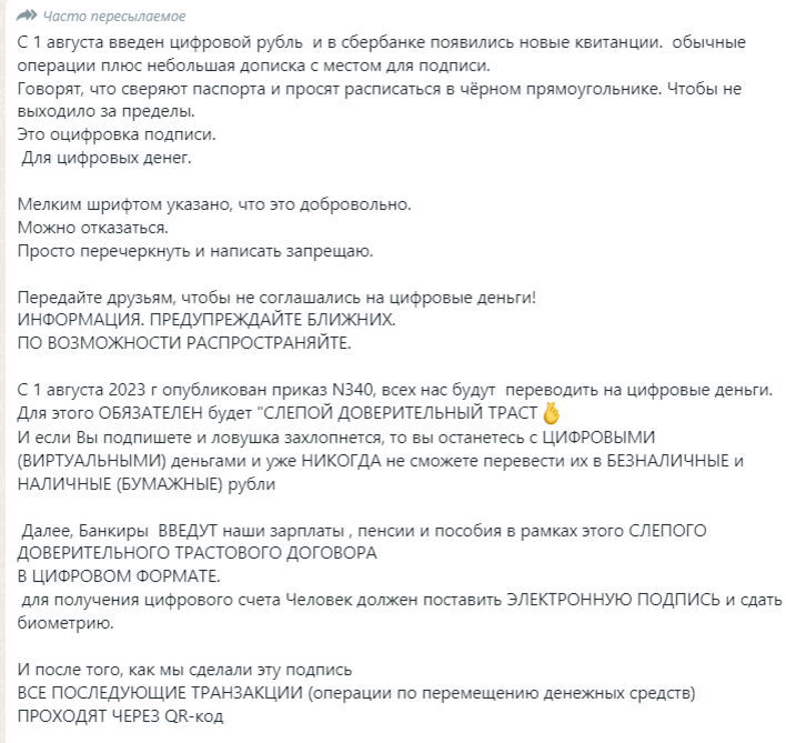 — С 1 августа 2023 года опубликован приказ № 340, всех нас будут переводить на цифровые деньги. Для этого обязателен будет «слепой доверительный траст». И, если вы подпишете, и ловушка захлопнется, то вы останетесь с цифровыми (виртуальными) деньгами и уже никогда не сможете перевести их в безналичные и наличные (бумажные) рубли. Далее банкиры введут наши зарплаты, пенсии и пособия в рамках этого слепого доверительного трастового договора в цифровом формате. Для получения цифрового счета человек должен поставить электронную подпись и сдать биометрию. И после того, как мы сделали эту подпись, все последующие транзакции (операции по перемещению денежных средств) проходят через qr-код. Уже нигде наша настоящая подпись будет не нужна. Ваша электронная подпись уже окажется в доверительном управлении у финансовой организации и Росреестре.