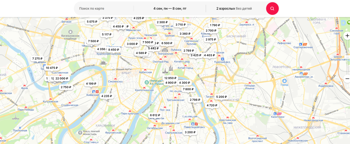 Цены. Я сравнил цены Суточно ещё с пятью сервисами. Запросил у всех отели на 4-8 сентября в Москве на двух взрослых до 16 000 рублей. Варианты есть везде, но на Суточно их больше, чем у других. Например, на Яндекс Путешествиях было всего несколько вариантов на юге Москвы. А на суточно раза в три больше.