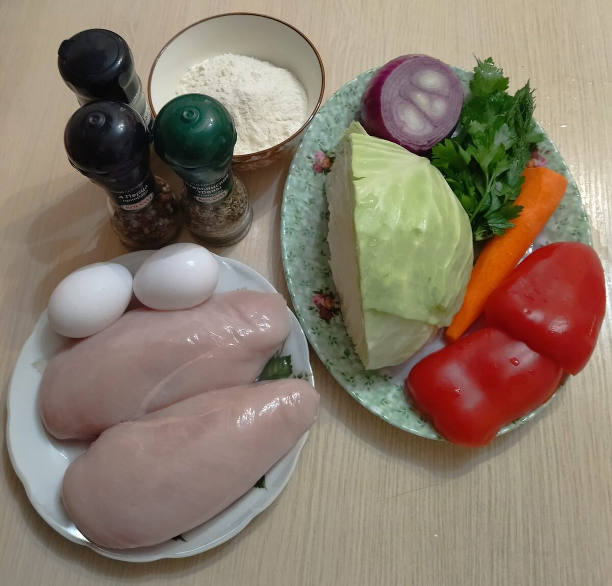 Всем привет! Сегодня на ужин будем готовить сочное, вкусное куриное филе в кляре. В дополнение к мясу приготовим витаминный салатик! Нам понадобится 2 штуки куриного филе, 2 яйца, мука, соль, перец, приправа для курицы. А для салата примерно 400 гр. капусты, 1 болгарский перец, 1 морковь и 1 красная луковица, зелень. Начинаем готовить. Филе нарезаем тонкими полосками, выкладываем на разделочную доску, накрываем плёнкой и отбиваем. Складываем мясо в ёмкость, солим, перчим, добавляем приправу и немного майонеза, оставляем мариноваться на час. Тем временем приготовим салат. Капусту мелко шинкуем, морковь натираем на крупной тёрке, лук режем полукольцами, перец полосками, зелень измельчаем. Складываем всё в салатник, солим, перчим, заправляем растительным маслом. Теперь приготовим кляр. Взбиваем яйца, добавляем соль и перец и постепенно добавляем муку, чтобы получилась масса без комочков. Кляр не должен быть жидким и не сильно густым. На сковороде разогреваем масло, каждый кусо