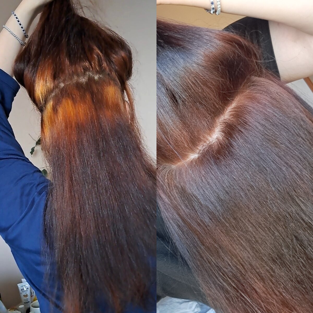 Ситуация: захотелось стать светлее, поэтому вы сделали осветление/смывку в домашних условиях. Но что-то пошло не по плану и появились пятна. Как исправить неудачное осветление в домашних условиях? Решение ситуации во многом зависит от того, в какой зоне у вас получился засвет (пятна) и какой они интенсивности. Если более светлый оттенок в прикорневой зоне, тогда выход из ситуации будет такой: добавить в рецепт для окрашивания прикорневой зоны краситель из базовой линейки на 1 тон темнее, чем желаемый. Это нужно сделать для того, чтобы цвет лег плотнее. Пример Это наш клиент. Как видно на фото, осветление волос было сделано неравномерно и из-за этого цвет в прикорневой зоне засветился и появились пятна. По длине также есть небольшие зоны с более темным пигментом. Желаемый результат Основные пожелания клиента были прежде всего закрасить пятна и выровнять цвет, по оттенку хотелось медный, коричнево-медный. Фото желаемого результата клиент прикрепил следущие: Если вы столкнулись с проб