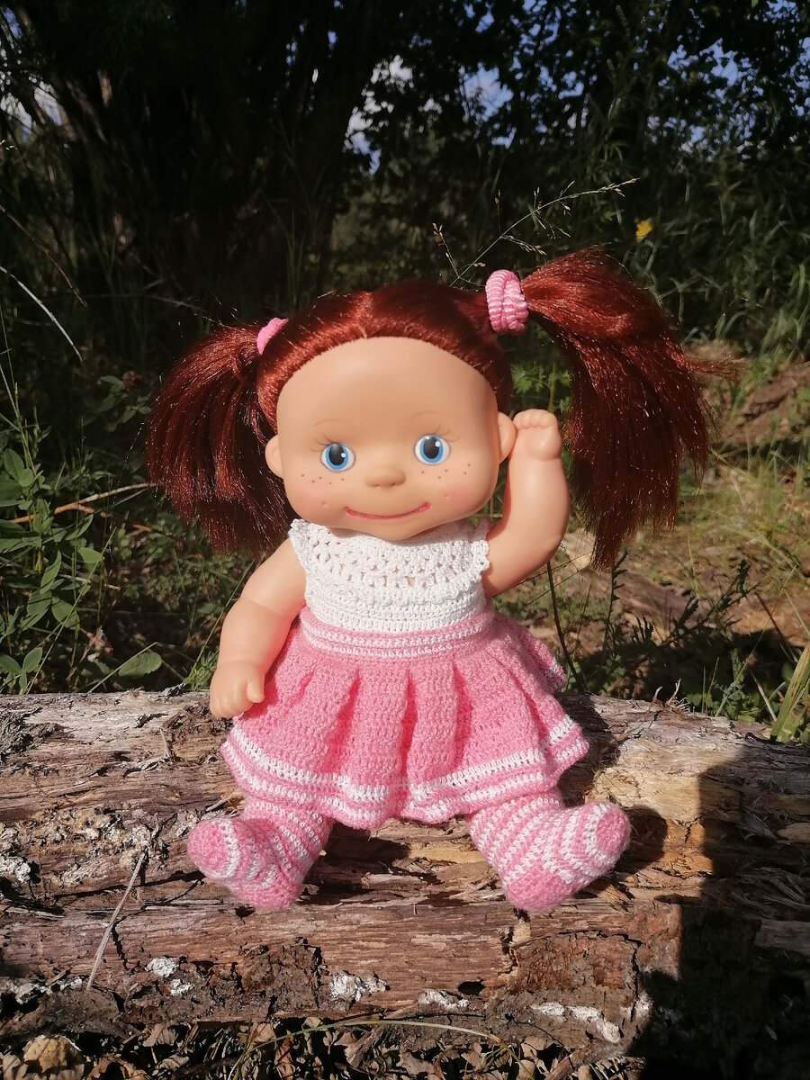 Продолжаем дефиле с Дуняшей. И сегодня вяжем юбку. Материалы те же: - пряжа типа Кроше - подходящий крючок - пуговица Эта задачка для самых усидчивых. Я пока вязала, вспомнила и придумала множество ругательных слов😁, ибо долго и надоедает. Набрать 270 воздушных петель. Петель должно быть в 3 раза больше необходимого количества. То есть если на поясе у нас будет 90 петель, значит, нужно набрать цепочку из 270 в.п. Вяжем поворотными рядами. 1 ряд: все сбн 2-9 ряд: все с1н. 10 ряд: белым - все псн 11 ряд: розовым - все псн 12 ряд: белым - все псн 13 ряд: розовым - рачий шаг. С юбкой закончили. Нить оборвать, закрепить, конец спрятать. Пояс Теперь нужно собрать плотно в складки. Провязываем по 6 сбн за 3 петли предыдущего ряда (см. Схему) Затем вяжем поворотными рядами ещё 5 рядов по 90 сбн, чередуя ряд белый, ряд розовый. Финальный ряд вяжем розовым цветом. По краю выполняем ряд обвязки сбн, формируя петлю (3 сбн, 5 в.п., пропустить петли, 3 сбн, 1 сс) Пришить пуговицу. Кофточ