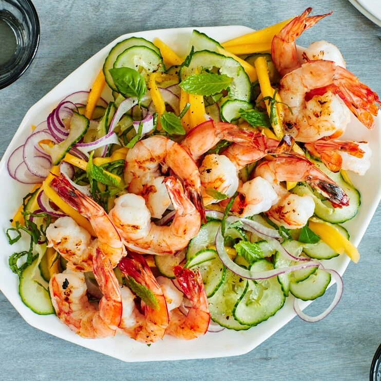 ИНГРЕДИЕНТЫ/8 ПОРЦИЙ: 2 измельченных зубчика чеснока, 400 г очищенных креветок, 1 большое манго, 3 огурца, 1 красная луковица, 2 ч.л оливкового масла, 2 ст.л сладкого чили соуса, 1 ч.л рыбного соуса, 1 ст.л рисового уксуса, мята, соль и перец.