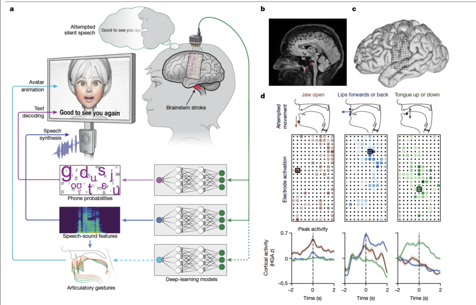 Исследователи разработали интерфейс мозг-компьютер, который позволил женщине с тяжелым параличом в результате инсульта ствола головного мозга говорить через цифровой аватар. Ученые имплантировали в мозг женщины электроды, которые регистрируют ее мозговые сигналы, и разработали алгоритмы машинного обучения, которые преобразуют эти сигналы в речь и эмоции аватара. Результаты исследования опубликованы в журнале Nature. Ученые из США и Великобритании работали с 47-летней пациенткой, 18 лет назад перенесшей инсульт ствола мозга и потерявшей способность говорить и произносить звуки из-за чрезвычайной слабости мышц лица, языка и голосовых связок (так называемая анартрия). Кроме этого, женщина не могла и писать и печатать на компьютере из-за паралича рук и ног (квадриплегия). В ходе эксперимента имплантировали тонкий как бумага массив из 253 электродов на поверхность мозга в область сенсомоторной коры (то есть выполнялась электрокортикография, ECoG, считывая активность этого участка головного
