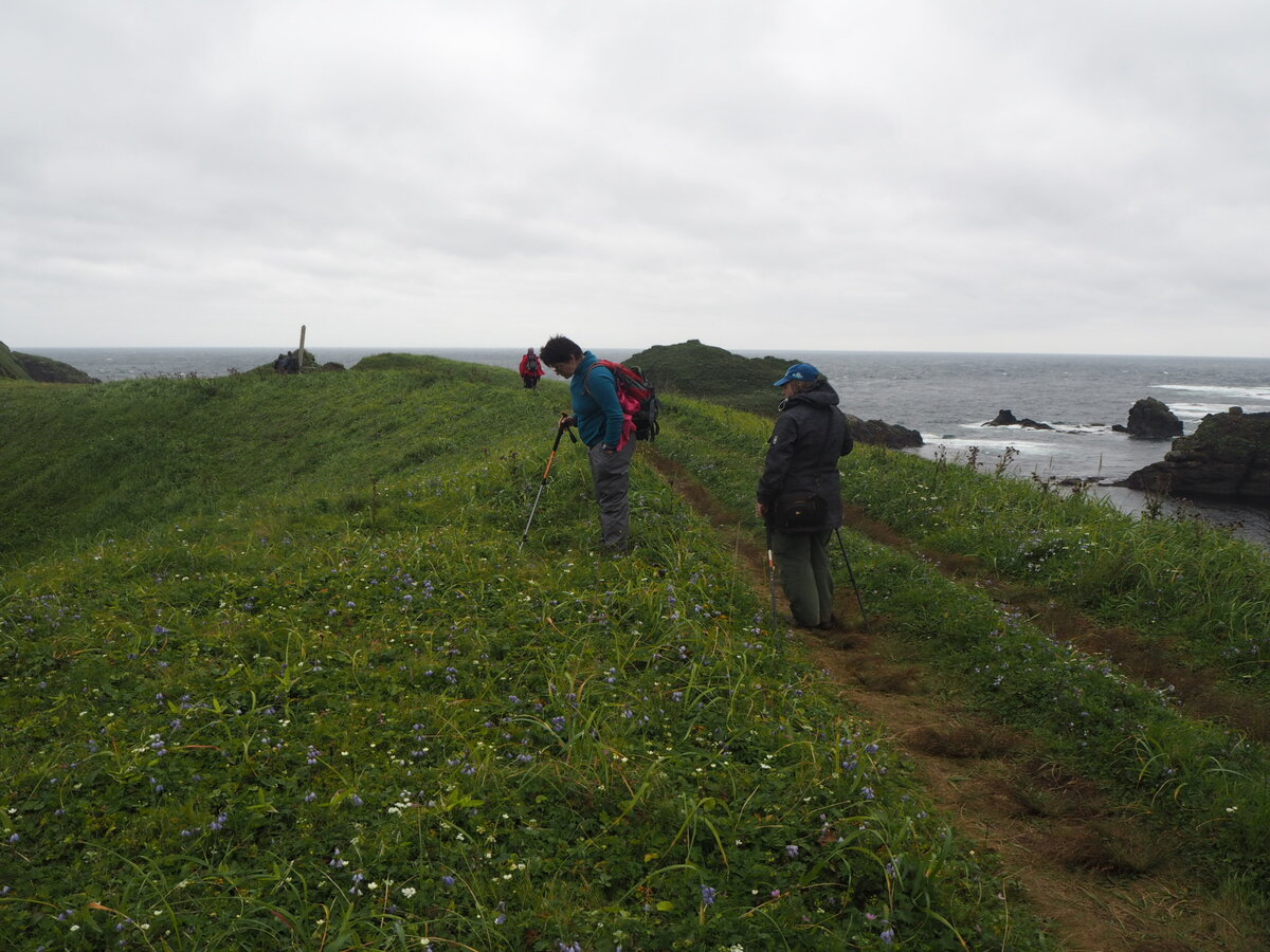 День десятый 14 августа Запланировала, что сходим на Край света и к маяку. Завтрак в девять. Соседи встали рано и в девять примерно уже вышли, думаю по тому же примерно маршруту. Пока мы собирались, они уже пришли обратно. Когда мы вернулись, их уже забирали машины. Прогулка получилась очень красивая и, на мой взгляд, экстремальная. Я пошла в сапогах, а на них почти нет протектора. Чтобы залезть на мыс Край света, надо было преодолеть крутой подъем. Добрые люди повесили верёвку на деревянный колышек. Наверх я влезла нормально, в вот вниз было страшновато лезть - ноги едут по откосу. Что сказать, дело не только в чудесном названии мыса Край света, но и в невероятной красоте этого места, скалы, обрывы, зелёный бархат растительности - снова бамбучник, но низкий, издалека похожий на стриженую траву , в бамбучнике тут и там разные цветы. Сопки скалы и океан, красота! И снова мы здесь совсем одни. На обратном пути поделились на героев и разумных людей. Герои решили срезать и полезли