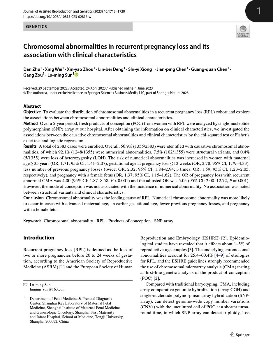 Привычное невынашивание беременности определяется 2мя и более потерями беременности в сроке до 20-24 недель по определению АSRM И EHRE. Встречается в 1-5% случаев у пар репродуктивного возраста. Хромосомные аномалии лежат в основе 25.4-60.4% причин ПНБ. По рекомендациям ESHRE первым генетическим анализом в такой ситуации должен быть ХМА. Отличия от стандартного кариотипирования: - может выявить проблему на некультивируемом материале за более короткое время, - определяет триплоидию, потерю гетерозиготности, однородительскую дисомию. Взаимосвязь хромосомынх аномалий и клинических данных помогает при генетическом консультировании пары. Итак, смотрим, что рассказывают коллеги в данной публикации. Учёные провели ретроспективное когортное исследование. 🔸️Материалы и методы: Взяты случаи с 02.2016 по 05.2020. Включены женщины с 2 и более потерями в сроке до 24 недель. Исключены - где произошла контаминация клетками матери, или был не понятен срок потери беременности. Хромосомные